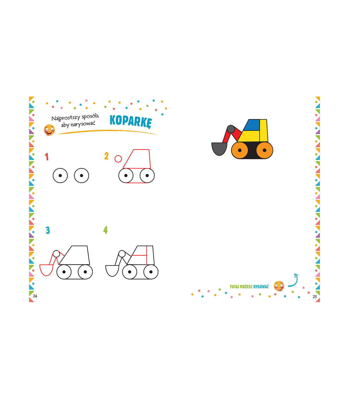 The way of drawing a given illustration is presented in turn in the four simplest steps. In each of the next stages of drawing, new elements for drawing have been clearly marked. Thanks to this, each child will be able to draw a car, a cat, a doll, a motorcycle or a tiger!