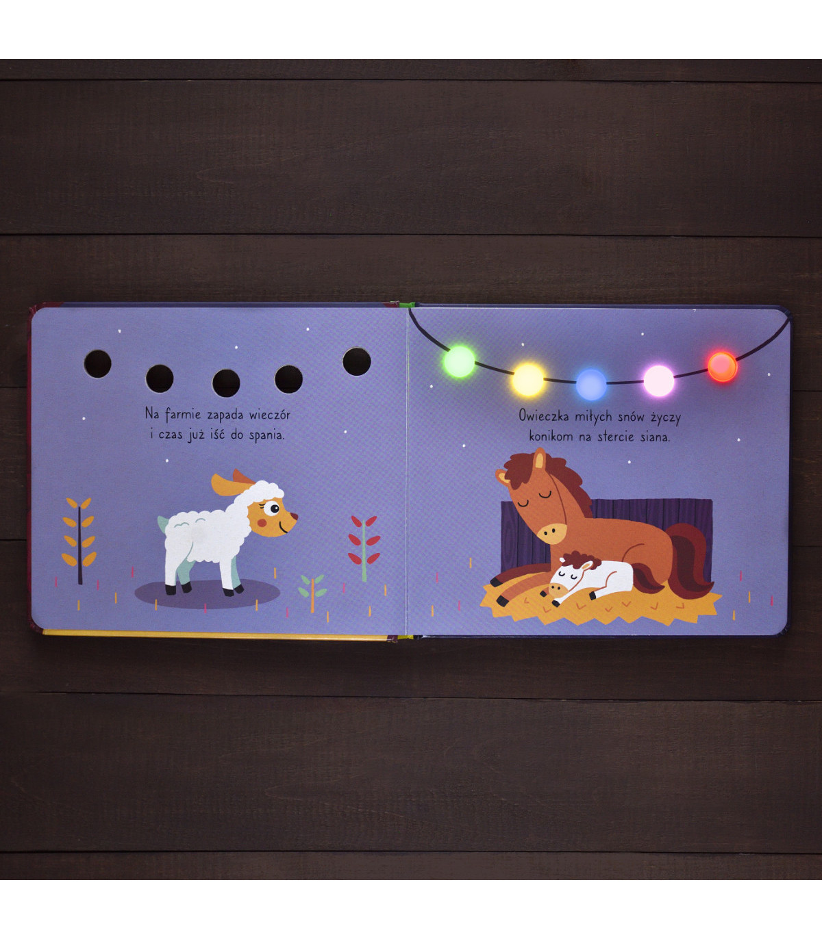 Książka ze światełkami o małej owieczce, która odwiedza wszystkie zwierzątka na farmie, by każdemu życzyć dobrej nocy przed spaniem.