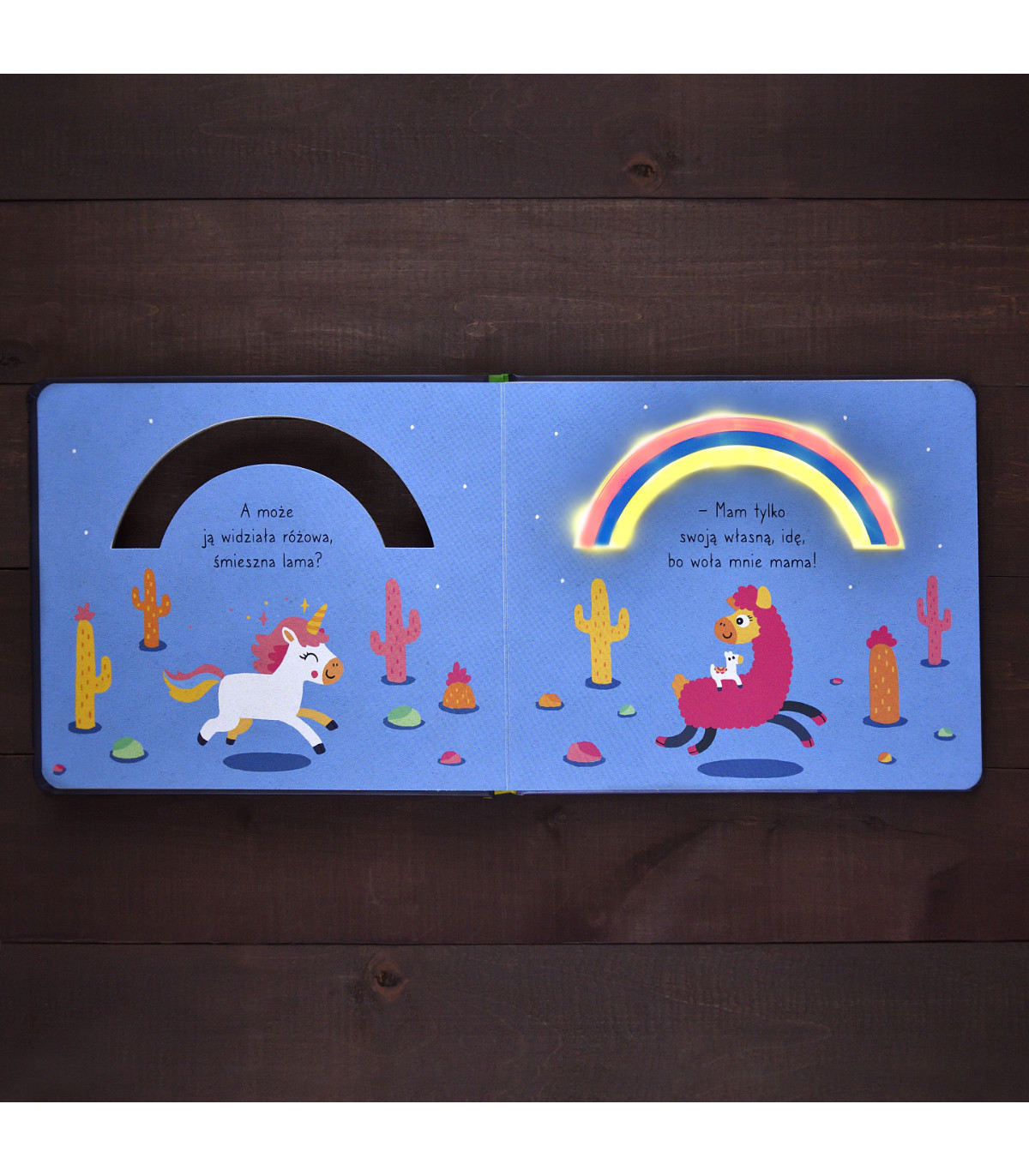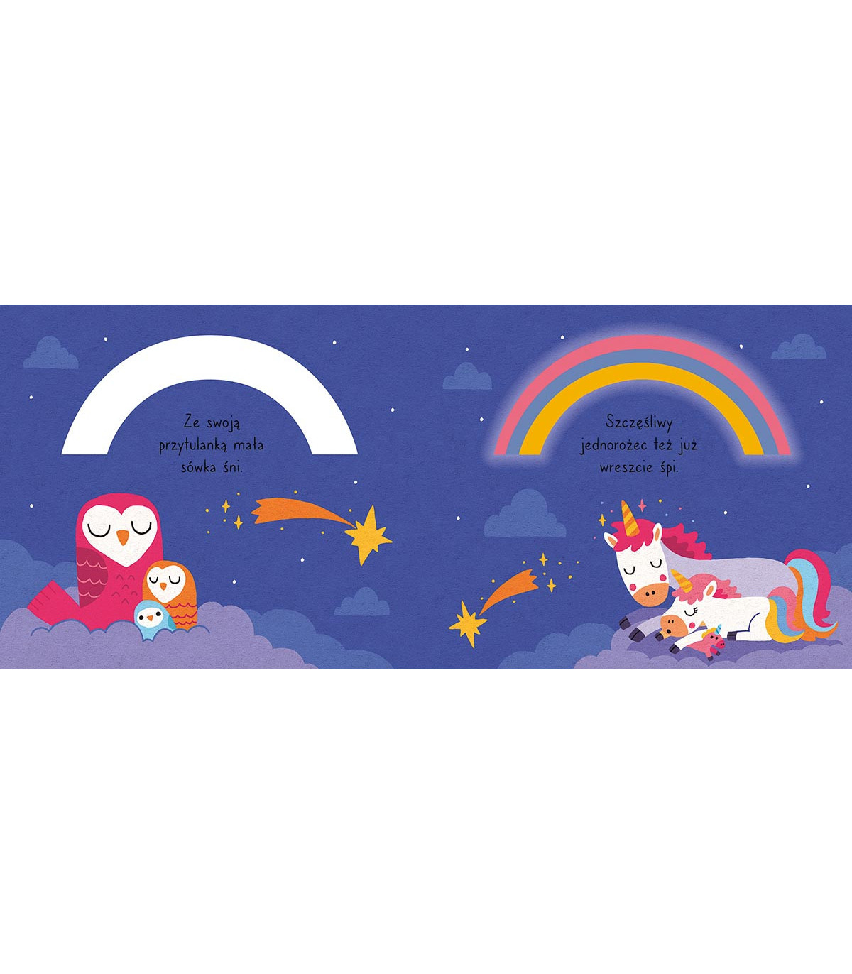 Książka ze światełkami o małym jednorożcu, który nie może zasnąć, ponieważ zgubił swoją ulubioną przytulankę. Odwiedza po kolei swoich przyjaciół by sprawdzić czy któryś z nich nie ma przypadkiem pluszaka.