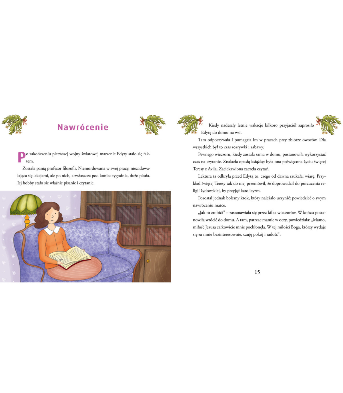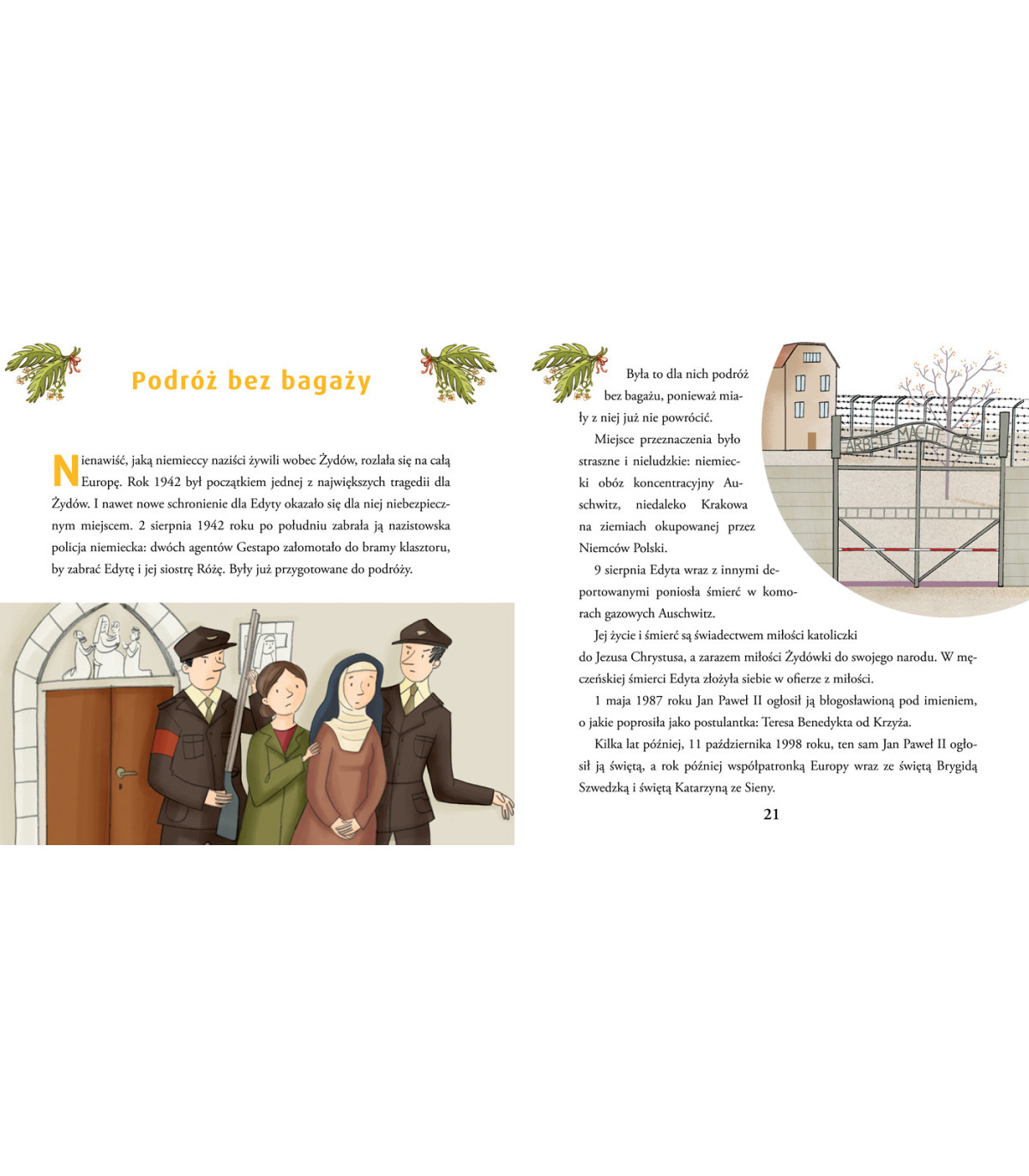 Książeczka przedstawia dzieciom w przystępny sposób jej życie pełne wiary, odwagi i zaufania Bogu – aż po męczeńską śmierć w obozie koncentracyjnym. To poruszająca opowieść o przyjaźni z Jezusem, wierności powołaniu i sile miłości, która zwycięża nawet w najtrudniejszych chwilach.