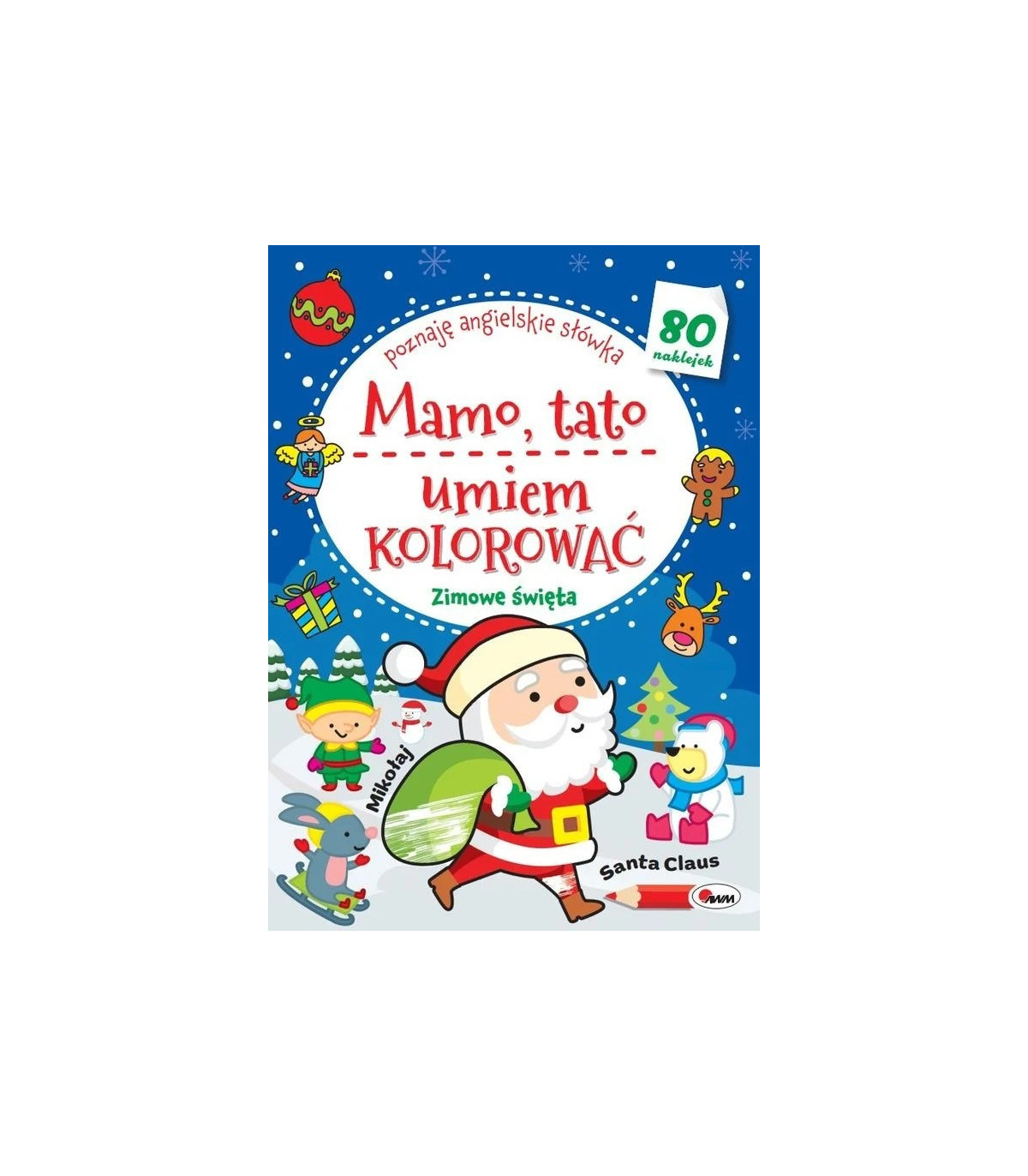 Książka zawiera sympatyczne ilustracje świąteczne. Jest przeznaczona dla dzieci w wieku przedszkolnym, które dopiero zaczynają przygodę z kolorowaniem. Zabawę urozmaicają naklejki stanowiące podpowiedź kolorystyczną. Mali artyści mogą z nich skorzystać lub nadać barwy według własnego pomysłu.