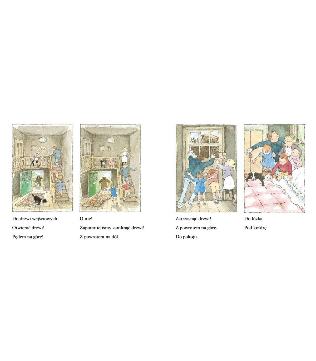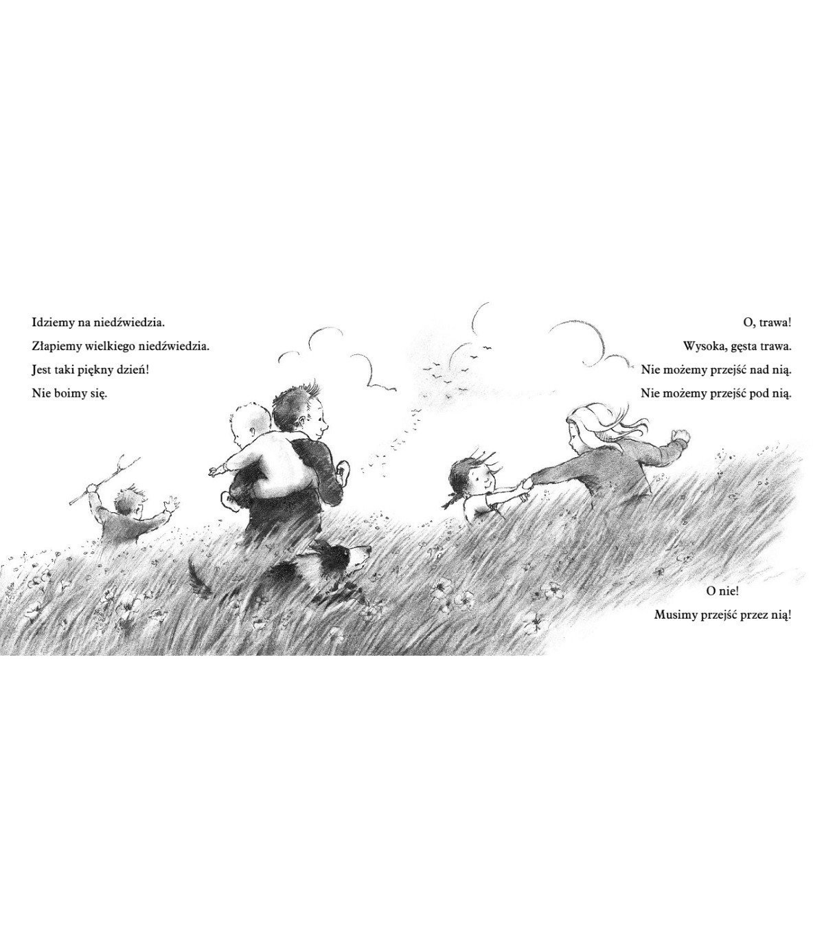 Czwórka dzieci, tata i pies wyruszaja na wyprawe w poszukiwaniu niedzwiedzia. Po drodze musza pokonac wiele przeszkód: wysoka trawe, rzeke, bloto, las, sniezyce... A gdy juz spotkaja niedzwiedzia? Przekonaja sie, ze w przeciwnym kierunku da sie je pokonac o wiele szybciej!