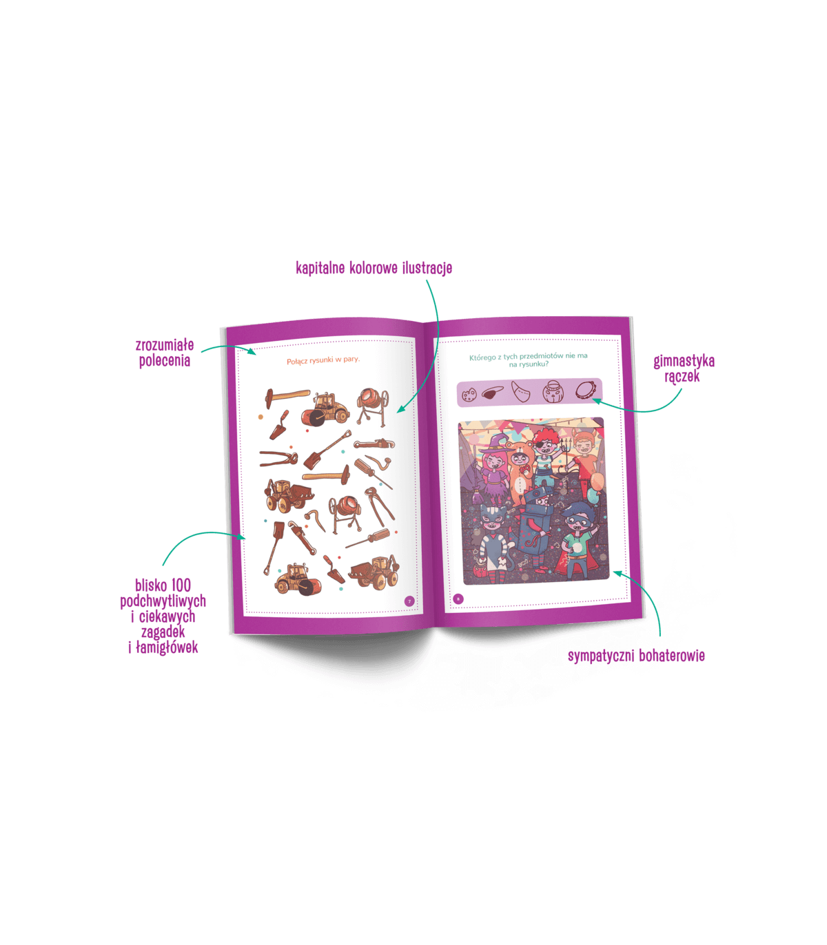 Na dzieci czekają różnorodne wyzwania, jak wyszukiwanie brakujących elementów, łączenie w pary, liczenie oraz porównywanie i szeregowanie. Blisko 100 zadań to kapitalny trening umysłu: koncentracji, spostrzegawczości oraz umiejętności myślenia logicznego.
