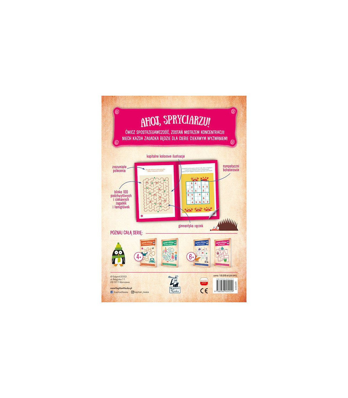 Szukanie drogi w labiryncie, liczbowe układanki oraz poszukiwanie brakującego elementu w ciągu obrazkowym to przykładowe zadania, dzięki którym spryciarze przygotują się do nauki czytania i liczenia. Zabawy grafotomoryczne zapewnią trening motoryki małej i przygotują do nauki pisania. Dzięki prostym poleceniom spryciarze będą mogli samodzielnie radzić sobie z rozwiązywaniem łamigłówek i łamaniem szyfrów. Kapitalne rysunki Macieja Łazowskiego, przedstawiające sympatycznych bohaterów z poczuciem humoru, przykuwają wzrok i sprzyjają koncentracji na zadaniu, a jednocześnie gwarantują świetną zabawę.