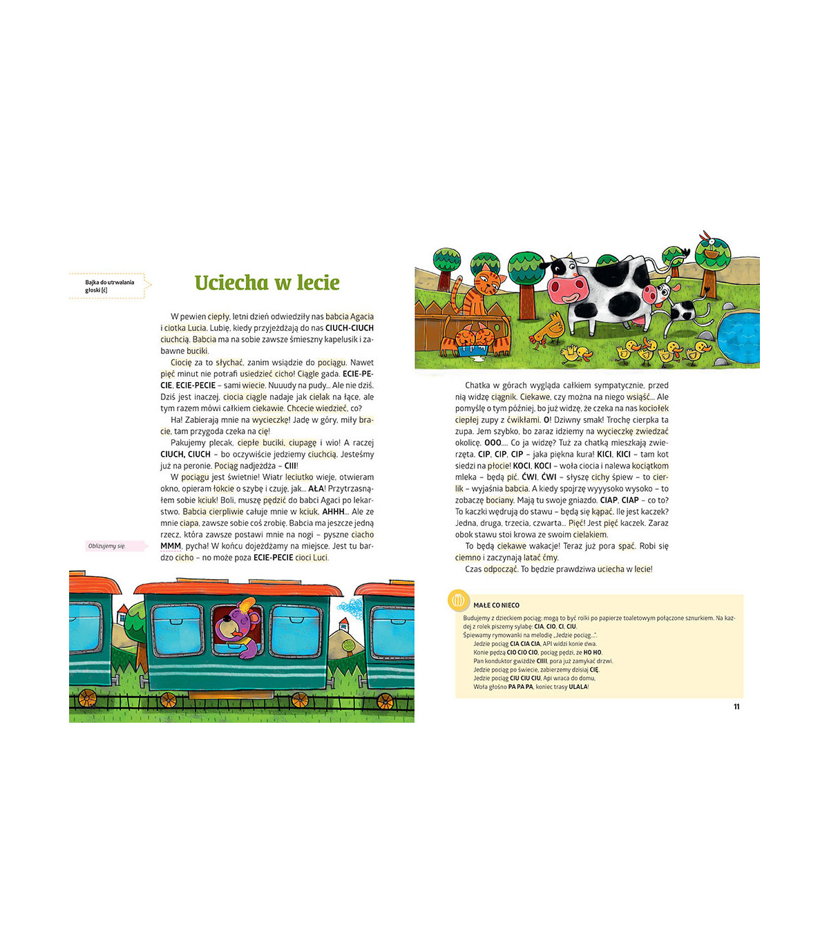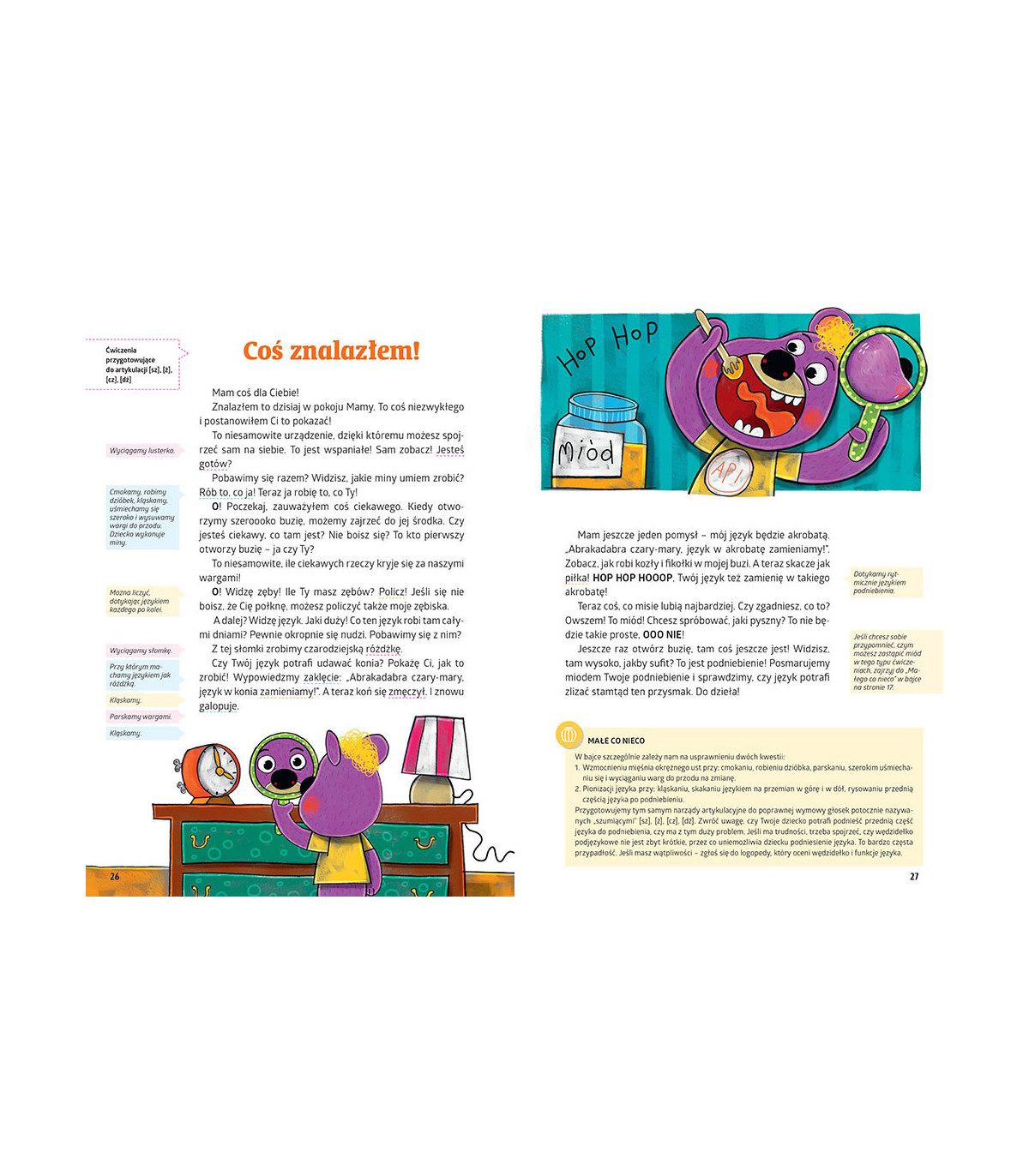 W środku znajduje się mnóstwo ćwiczeń, zadań i propozycji dodatkowych aktywności, które pomogą dziecku opanować daną głoskę lub poprawić wymowę. Dodatkowo autorki podpowiadają, kiedy warto wybrać się do specjalisty.