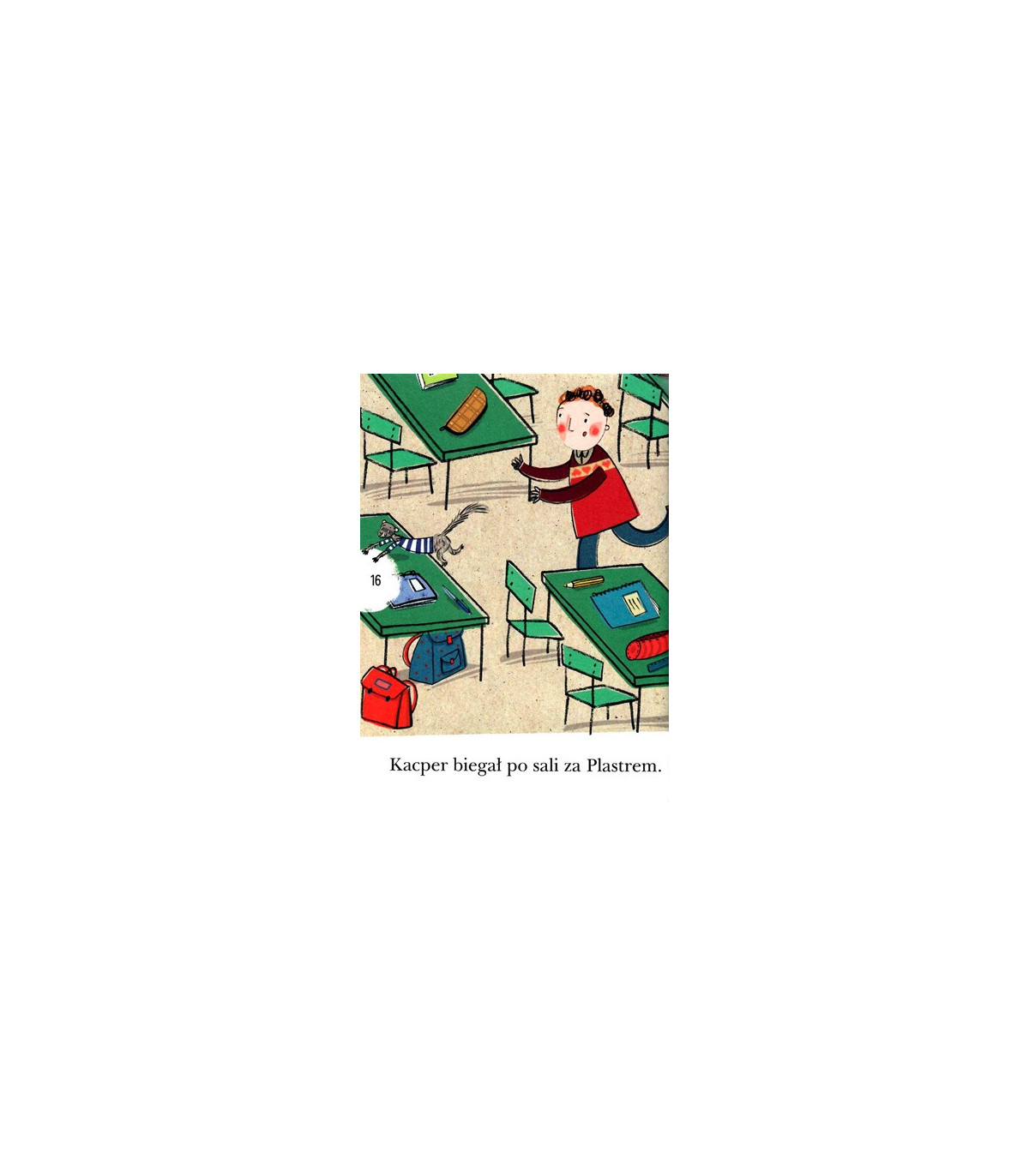 Jest to opowiadanie o chłopcu, który miał wesołą fretkę. Kacper traktował fretkę Plastra jak kumpla od serca. Pewnego dnia wpadł na pomysł, że zabierze zwierzę ze sobą do szkoły. Gdy tylko weszli razem do klasy, zaczęły się kłopoty. Plaster uwielbiał się bowiem bawić i wariować. Wyjrzał z torby i ujrzał osy. To spowodowało, że fretka uciekła z plecaka i zaczęła gonić po całej sali owady. Za fretką podążył Kacper, a za nim koledzy. Kiedy spadł tynk z sufitu, w końcu Kacprowi udało się złapać fretkę, a osy wygonić za okno.