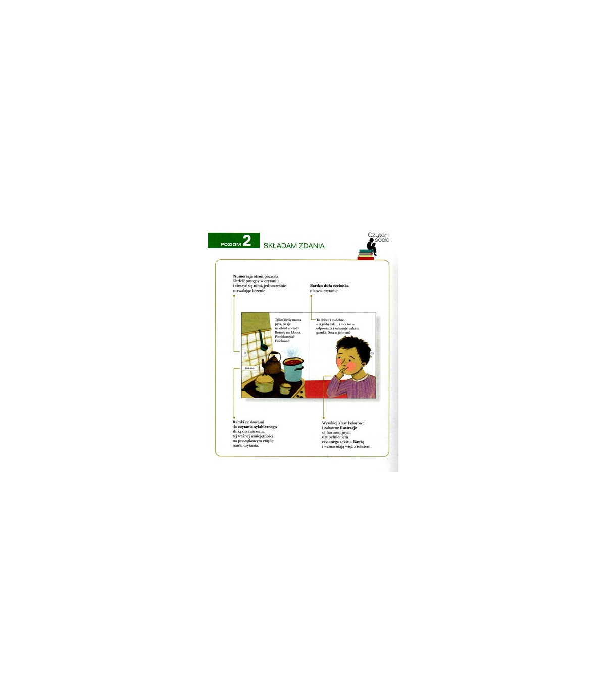 Składam zdania, drugi poziom serii Czytam sobie, to dobry pomysł na kontynuację nauki czytania. Świetne, zabawne historie są dziełem wybitnych polskich autorów. Opowiadania napisane są dłuższymi zdaniami oraz zawierają elementy dialogu. Bardzo duża czcionka ułatwia czytanie, a zamieszczone po bokach stron ramki służą do ćwiczenia sylabowania. Wysokiej klasy kolorowe i zabawne ilustracje są harmonijnym uzupełnieniem czytanego tekstu. Forma książek zgodna jest z zaleceniami metodyków.