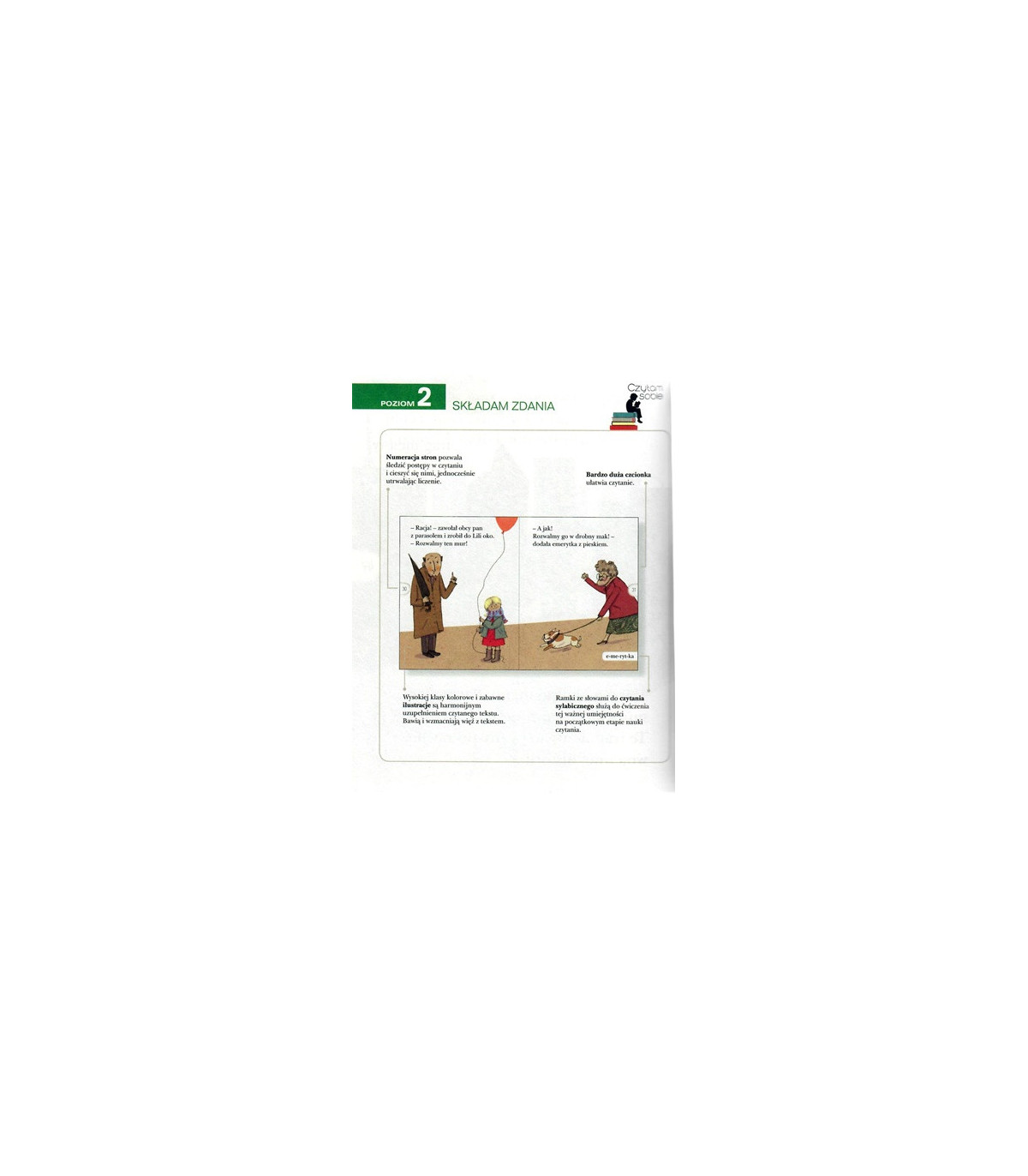 Składam zdania, drugi poziom serii Czytam sobie, to doskonała propozycja dla dzieci, które kontynuują naukę czytania. Dłuższe zdania oraz elementy dialogu będą stanowiły wyzwanie, ale bardzo duża czcionka ułatwia lekturę, a zamieszczone po bokach stron ramki służą do ćwiczenia sylabizowania. Zrozumienie tekstu ułatwiają przepiękne kolorowe ilustracje autorstwa Doroty Łoskot-Cichockiej. Teksty z drugiego poziomu serii składają się z 800-900 wyrazów opartych na 23 podstawowych głoskach oraz "h". Forma książek w kolekcji Czytam sobie zgodna jest z zaleceniami metodyków.