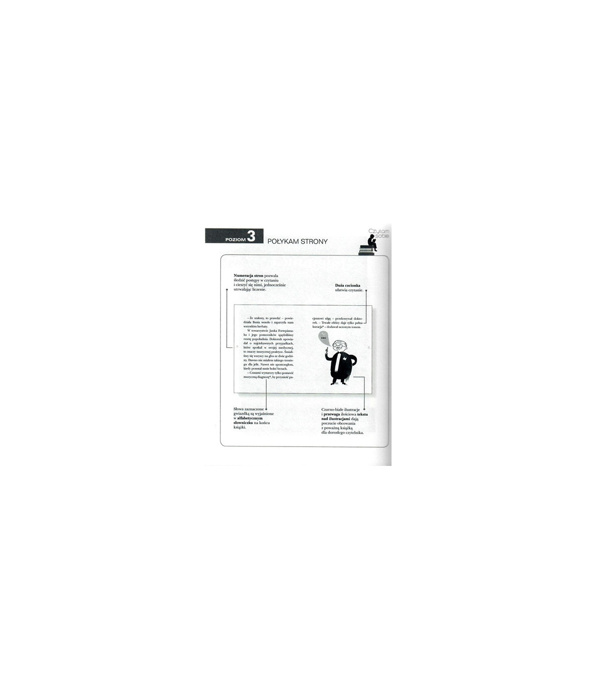 Poziom trzeci wspomagającej czytanie serii Czytam sobie to wciągające, złożone opowiadania z dużą czcionką, która ułatwia samodzielne czytanie. Aby dziecko mogło wejść na kolejny etap czytelniczej drogi, historia opowiedziana jest dłuższymi zdaniami, a trudniejsze słowa oznaczono gwiazdką i wyjaśniono w słowniczku pojęć znajdującym się z tyłu tomu. Teksty złożone są z 2500-2800 słów i wszystkich głosek języka polskiego. Czarno-białe, "dorosłe" ilustracje Tomka Kozłowskiego i przewaga tekstu nad warstwą graficzną sprawiają, że dziecko ma poczucie obcowania z prawdziwą literaturą.