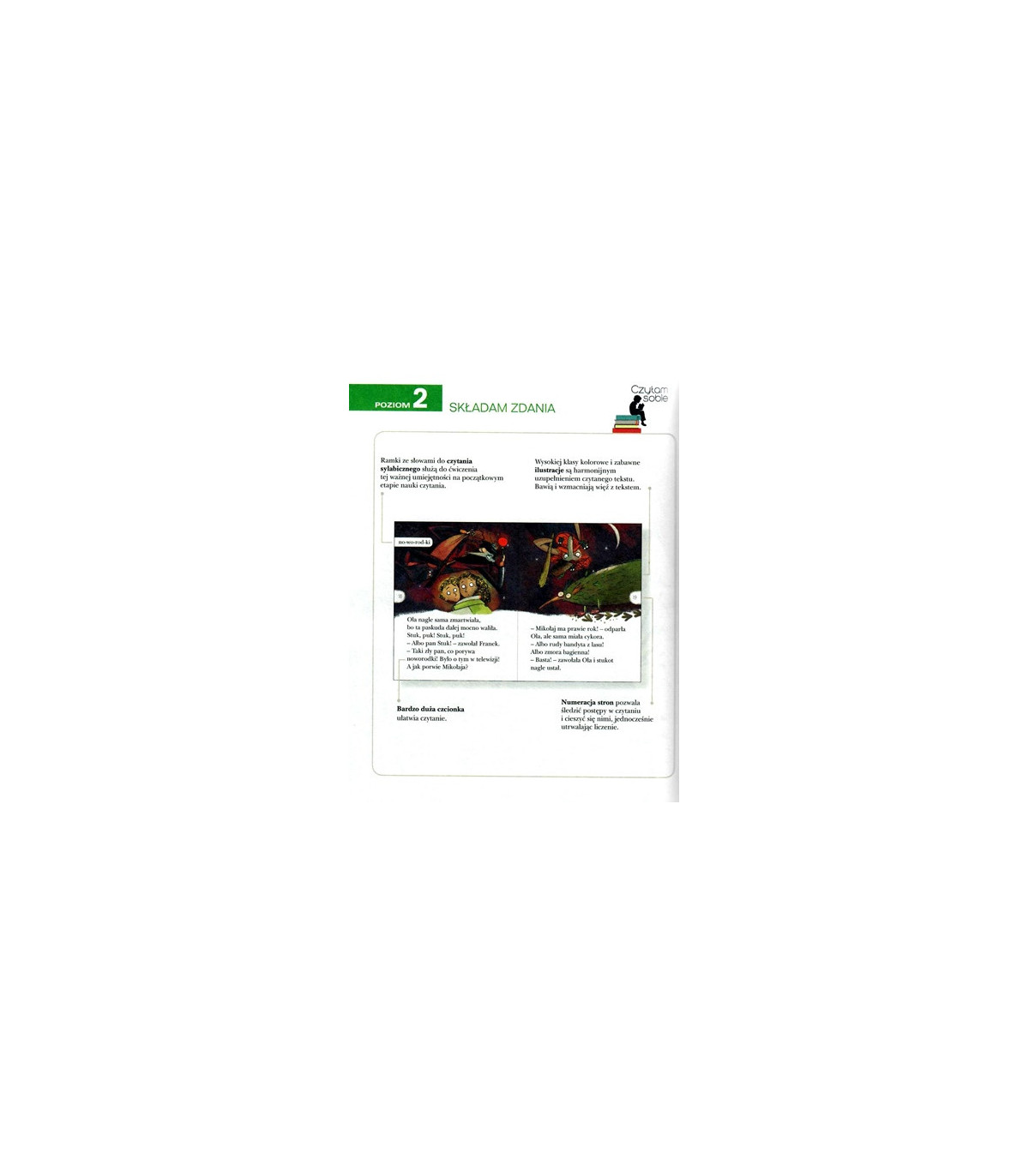 Czytam sobie to trzypoziomowy program wspierający naukę czytania. Książki na poziomie drugim serii wprowadzają dzieci w świat dłuższych, bardziej złożonych zdań i historii. Teksty składają się z 800-900 wyrazów, zawierają elementy dialogu i 23 podstawowe głoski języka polskiego oraz głoskę "h". Dodatkowo umieszczone na stronach ramki pozwalają na ćwiczenie sylabizowania. Na końcu każdej książki znajduje się dyplom uznania dla dziecka, które ją przeczytało, a także kolorowe naklejki.