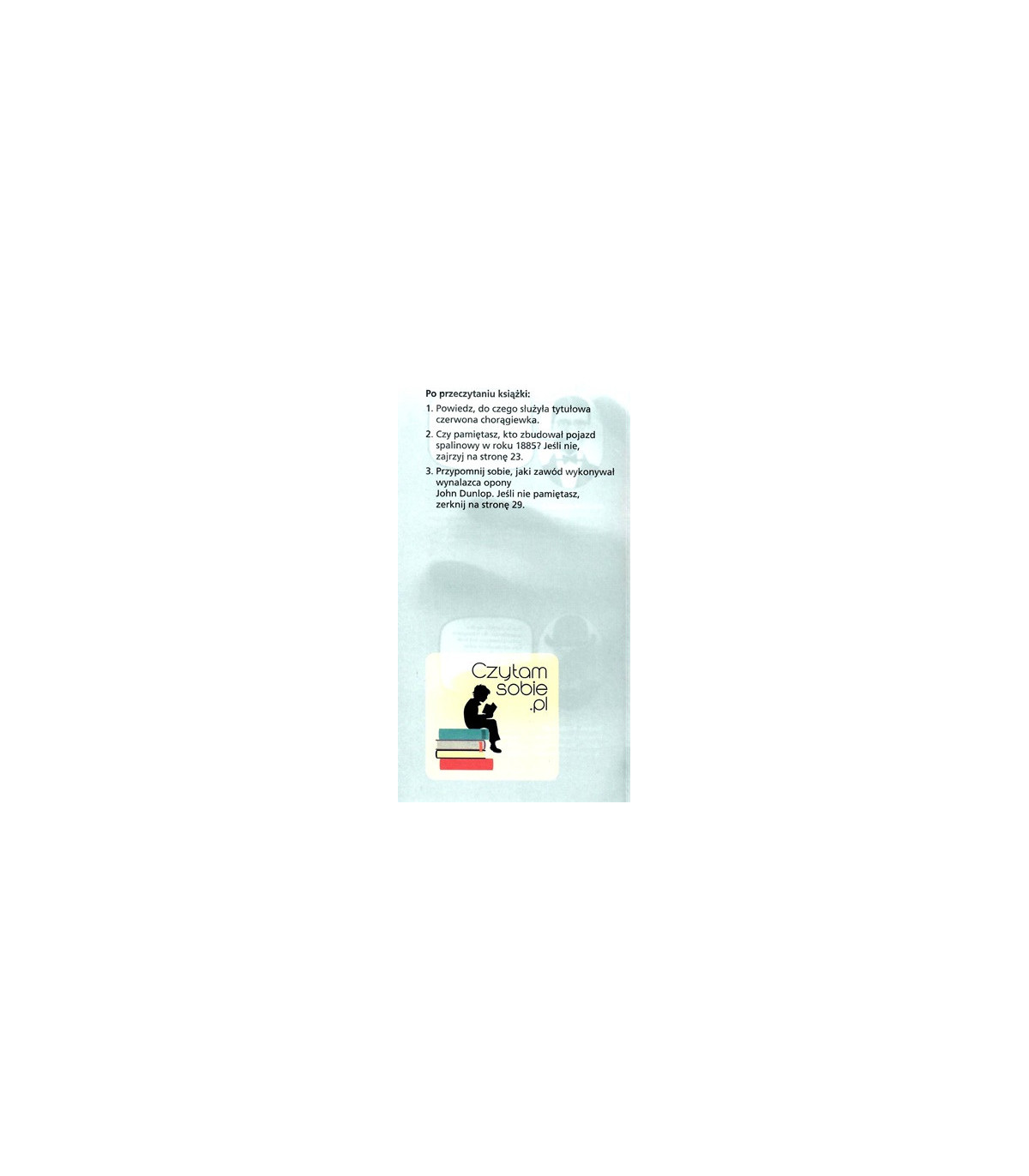 Bohaterem tej ciekawej historii jest kilkuletni chłopiec, którego tata pracuje jako "człowiek z czerwoną chorągiewką" - czyli jako osoba, która w epoce pierwszych automobilów ostrzegała przechodniów przed nadjeżdżającym samochodem. Dzieci znajdą w książce również informacje o ważnych dla rozwoju motoryzacji osobach, takich jak Henry Ford czy Karl Benz, będą mogły zrobić notatki, a także wkleić naklejki. Otrzymają również dyplom ukończenia pracy z książką.