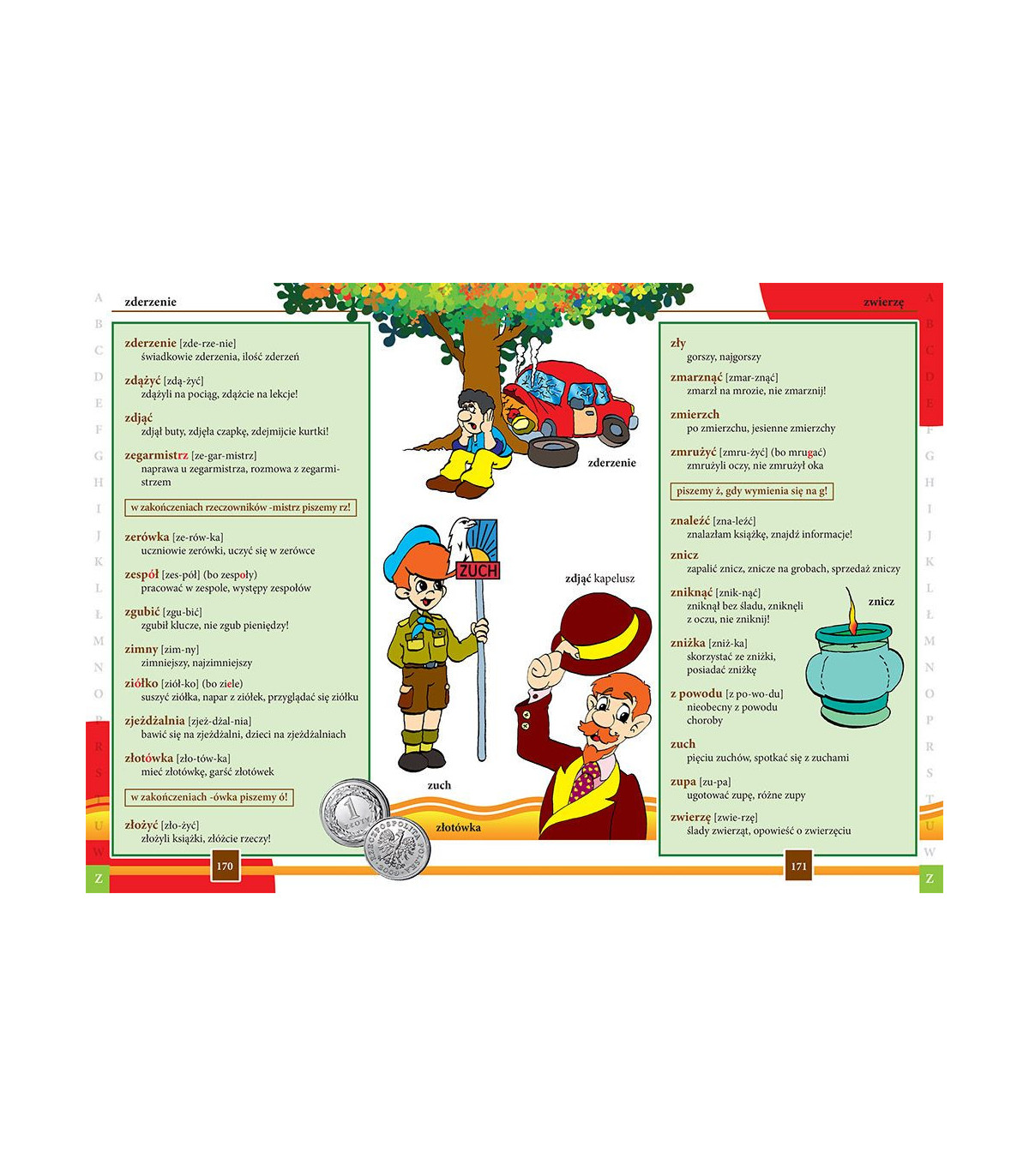 Słowniczek zawiera również podstawowe reguły ortograficzne z przydatnymi przykładami. Przejrzysty układ na stronie, wyróżnienia wyjątków, liczne wyjaśnienia odnośnie pisowni to dodatkowe atuty słownika . Opracowany przez najlepszych nauczycieli stanowi doskonałą pomoc w pierwszych latach nauki.
