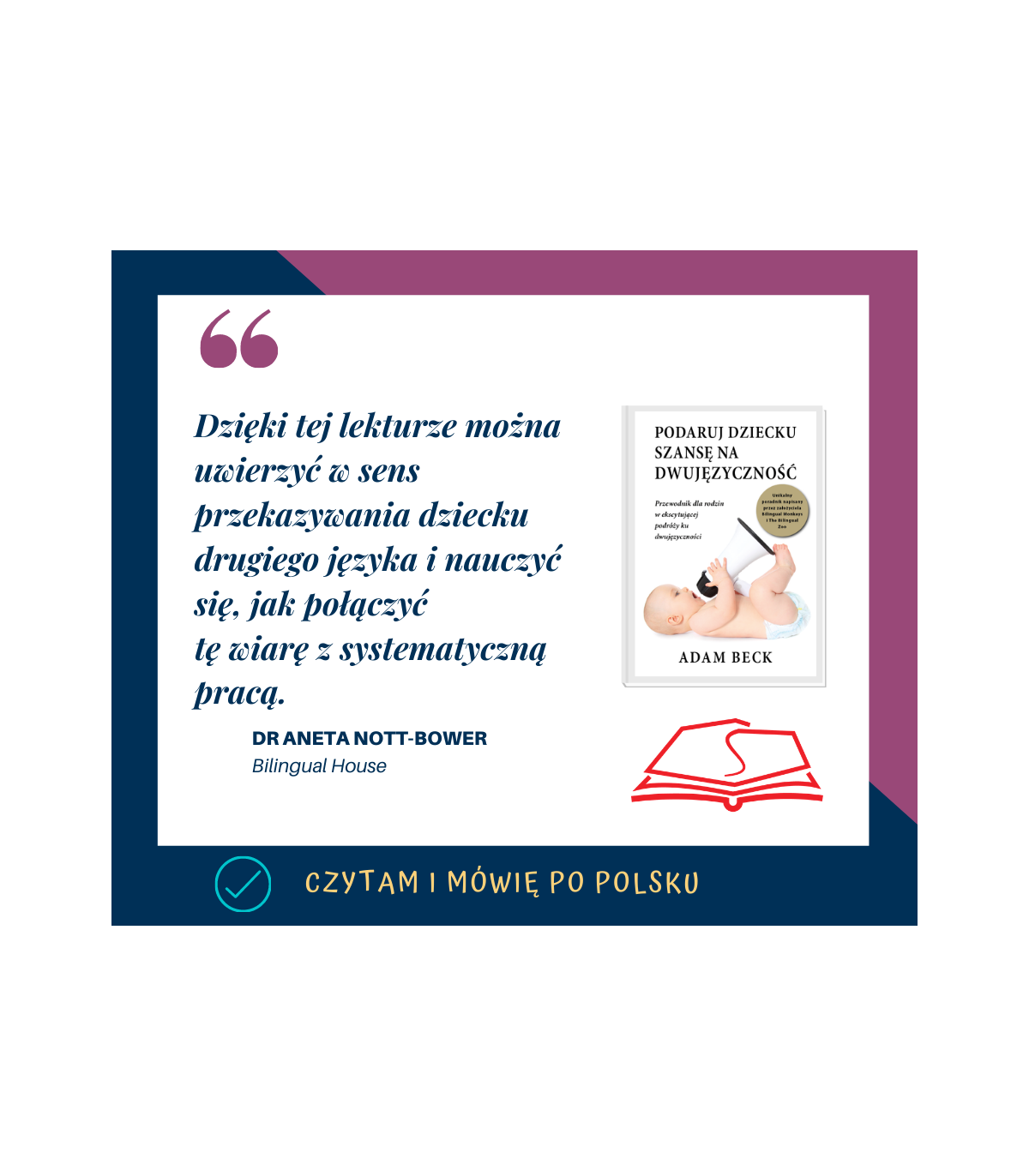 dwujęzycznej, które mają język polski jako mniejszościowy, książka „Podaruj dziecku szanse na dwujęzyczność” zmotywowała mnie do uczenia języka polskiego jeszcze bardziej i dała pomysły jak to robić. Autor zwraca bardzo dużą uwagę na czytanie w języku mniejszościowym, bo to wzbogaci dziecka słownictwo, zwłaszcza młodzieży. Zaleca, żeby czytać dzieciom i młodzieży w języku mniejszościowym co najmniej 15 minut dziennie. Odkąd zaczęłam czytać z moim 12-letnim synem, on teraz sam przychodzi i mówi, że chce czytać po polsku. Autor też mówi, żeby bawić się i grać w gry z dziećmi w języku mniejszościowym. To sprawia, że ten język kojarzy się dziecku z pozytywnymi emocjami, co pomaga w uczeniu języka polskiego na obczyźnie. Czytanie i gry i zabawy pomogą nam zbudować relacje z dzieckiem w języku mniejszościowym. Każdy rodzic, który jest w rodzinie dwujęzycznej, powinie przeczytać tę książkę. Nigdy nie jest za późno na naukę języka polskiego. Lidia