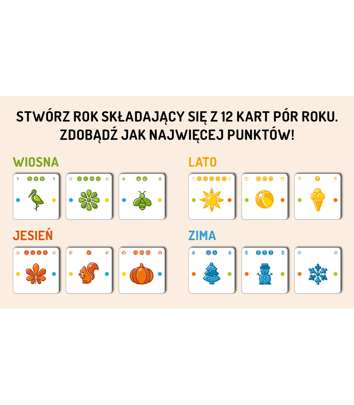 Staracie się zdobyć 12 kart tworzących rok. Wygra osoba, która stworzy rok z największą liczbą punktów.