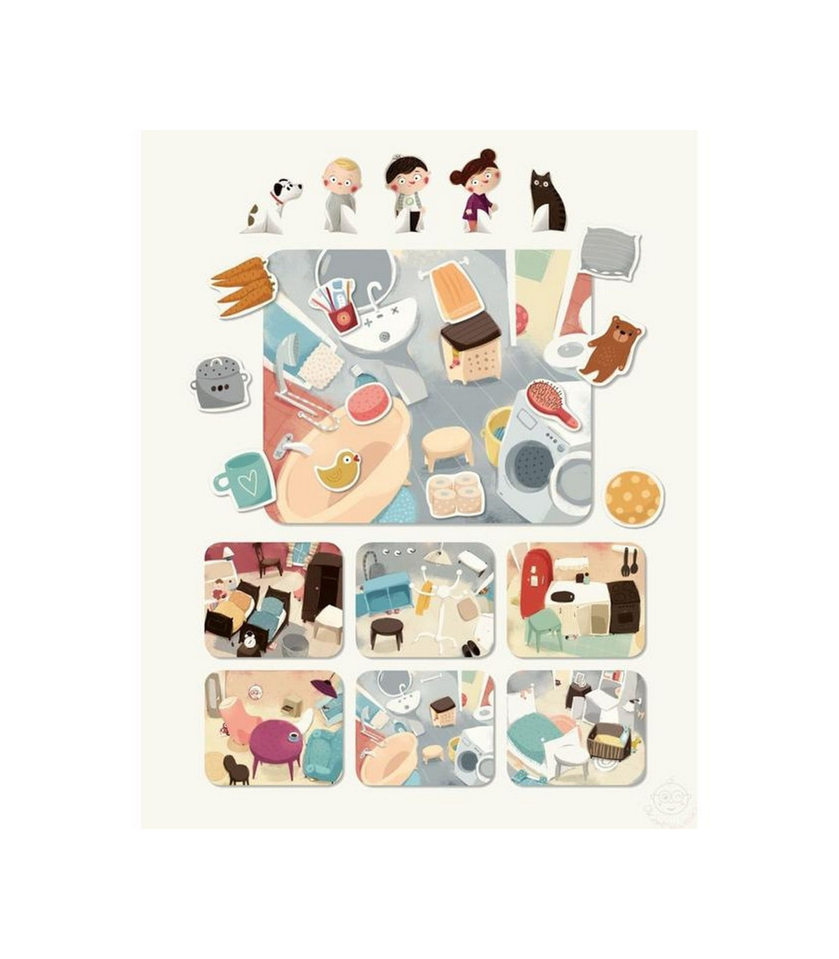 W pudełku znajduje się 6 plansz z różnymi pomieszczeniami w mieszkaniu należącym do rodziny naszego bohatera. Do każdego z nich dopasowano po 6 żetonów z przedmiotami charakterystycznymi dla tych pomieszczeń. Dziecko układa przedmioty w odpowiednich miejscach na planszach (np. na stoliku w salonie, pod krzesłem w kuchni, w pudełku) według załączonej instrukcji lub poleceń wymyślonych przez rodzica. Uczy się przy tym rozumienia stosunków przestrzennych, czyli położenia przedmiotów względem siebie.
