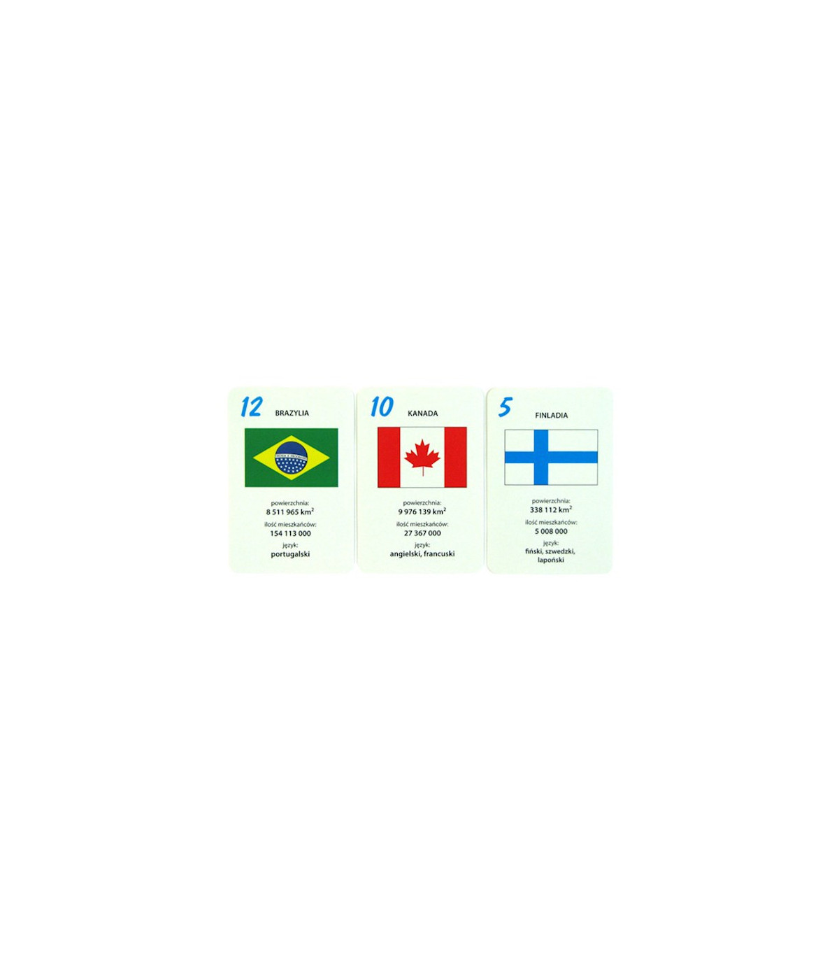 Zestaw 25 kart do rozegrania dwóch kochanych przez wszystkie dzieci gier – Pamięć i Piotruś. Rozgrywka jest wspaniałym wstępem do zapoznania się z kilkoma podstawowymi informacjami na temat wybranych krajów. Na kartach znajdziemy ilustracje z flagami oraz informacje na temat powierzchni, liczby ludności i języka urzędowego.