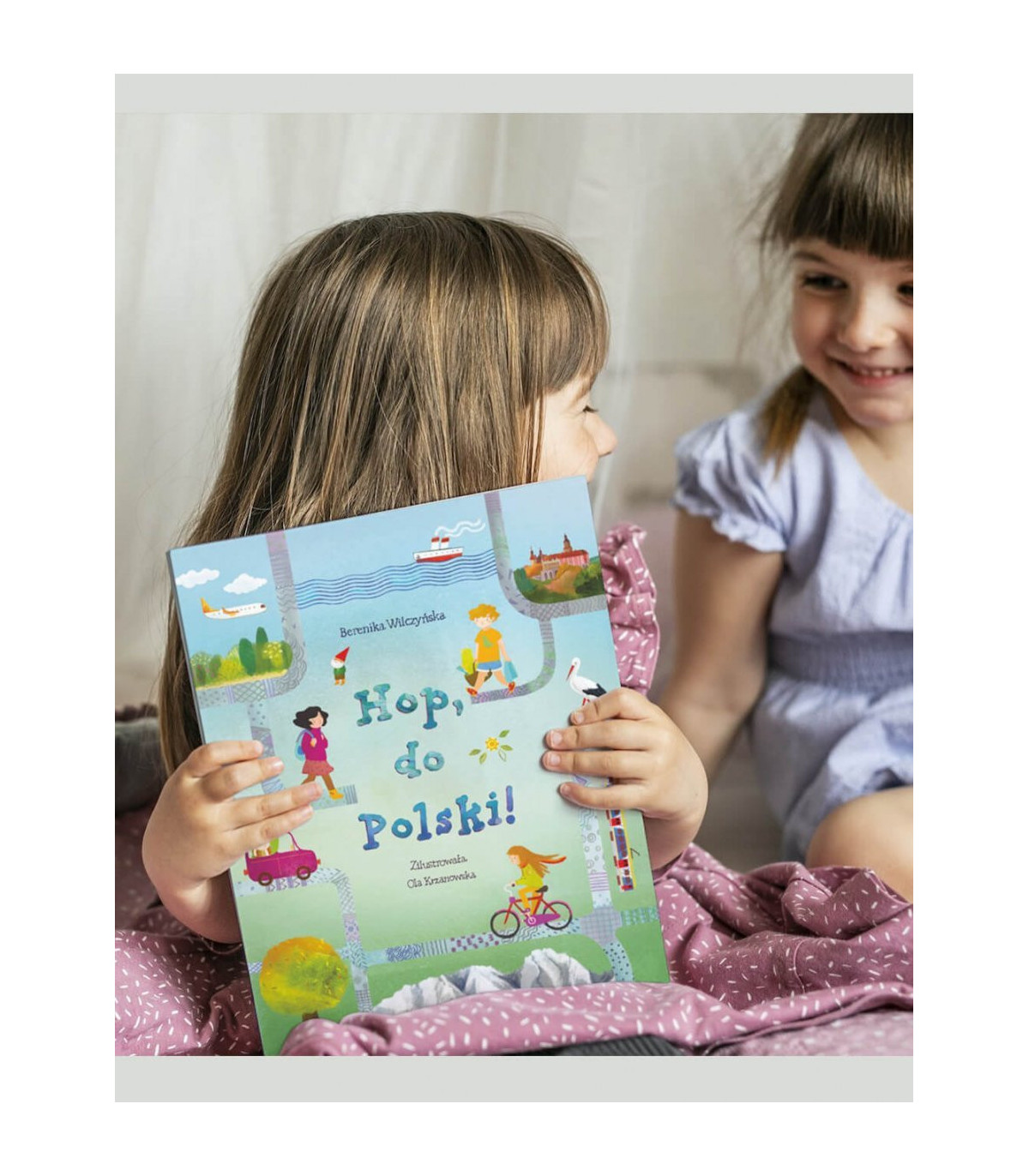 Książka „Hop, do Polski!” to literacka odpowiedź na pytanie, co i w jaki sposób opowiadać dzieciom, aby poszerzać ich wiedzę na temat Polski oraz budować więź z jej dziedzictwem kulturowym. Może być punktem wyjścia do rozmów na temat Polski – jej krajobrazu, zabytków, historii oraz tradycji.