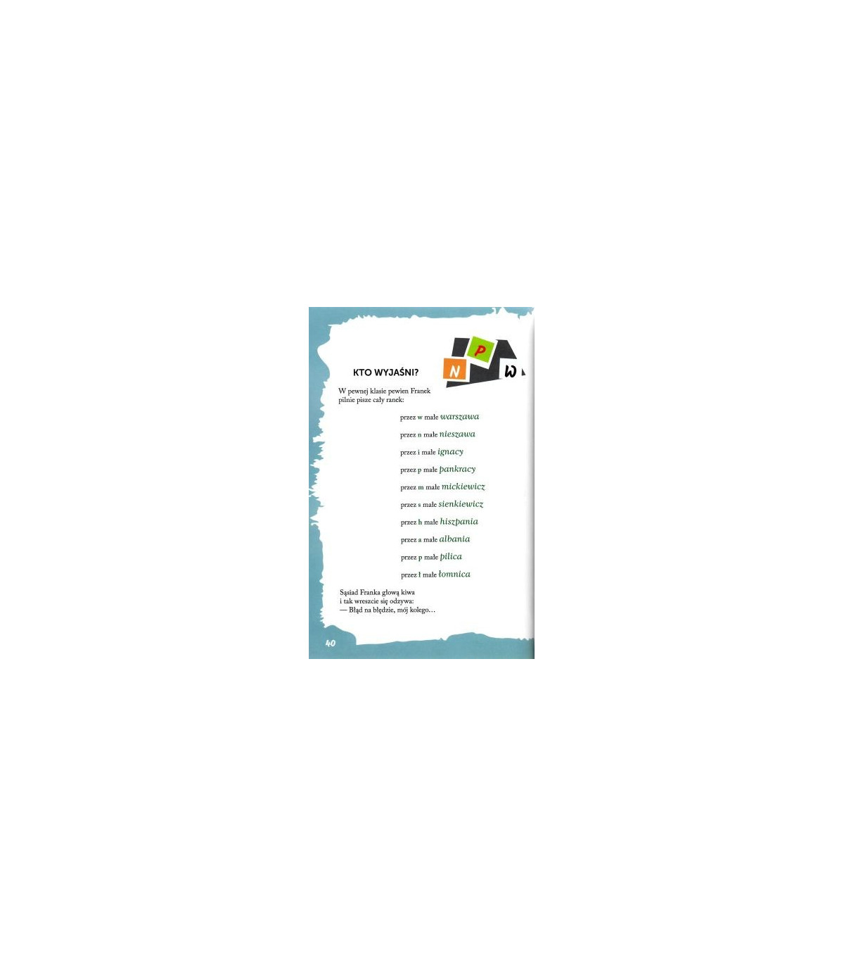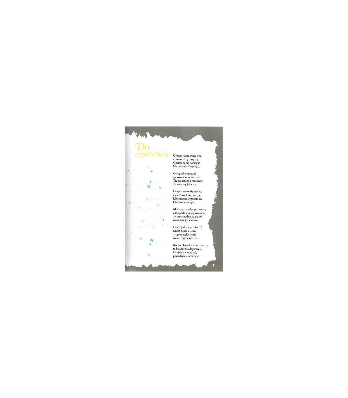 Każdy wiersz to zabawna historyjka, poświęcona konkretnej regule czy zagadnieniu. Książka bawi, uczy i zaciekawia, rozwijając zainteresowanie językiem polskim. Pełna jest kolorowych ilustracji, ściśle współgrających z tekstami utworów. Zapraszamy do lektury!