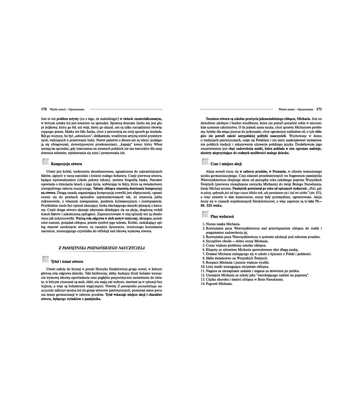 Wydanie Wyboru nowel Henryka Sienkiewicza kompletne bez skrótów i cięć w treści. W tym wydaniu znajdziesz odpowiedzi na pytania z podręcznika - „pewniak na teście”, czyli wskazanie zagadnień, które zwykle pojawiają się w pytaniach z danej lektury we wszelkich testach sprawdzających wiedzę, a także w podręcznikach i na klasówkach. Książka zawiera pełen tekst lektury. Na końcu książki zamieszczono opracowanie, w którym znajduje się bardzo szczegółowe streszczenie oraz drugie skrócone, ułatwiające szybkie przygotowanie się przed lekcją. Opracowanie zawiera ponadto plan wydarzeń, wnikliwie wyjaśnioną problematykę oraz szerokie charakterystyki bohaterów.