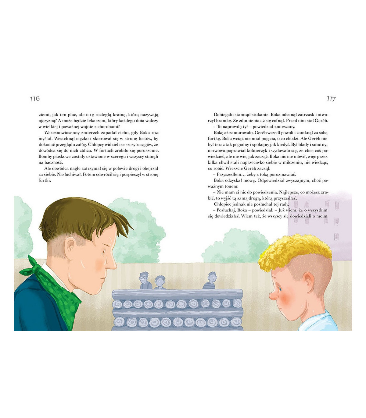 Główny bohater, choć z pozoru jest najsłabszym ogniwem swojej grupy, wykazuje się niezwykłą odwagą i zdobywa szacunek kolegów. Podejmuje szereg heroicznych czynów, w których efekcie zachorował na zapalenie płuc. Mimo choroby bierze udział w decydującej bitwie, ostatkiem sił przyczyniając się do zwycięstwa nad Czerwonymi Koszulami. Jaką cenę przyjdzie Ernestowi Nemeczkowi zapłacić za bohaterskie czyny? Czy Janosz Boka i jego kompani ocalą Plac Broni?