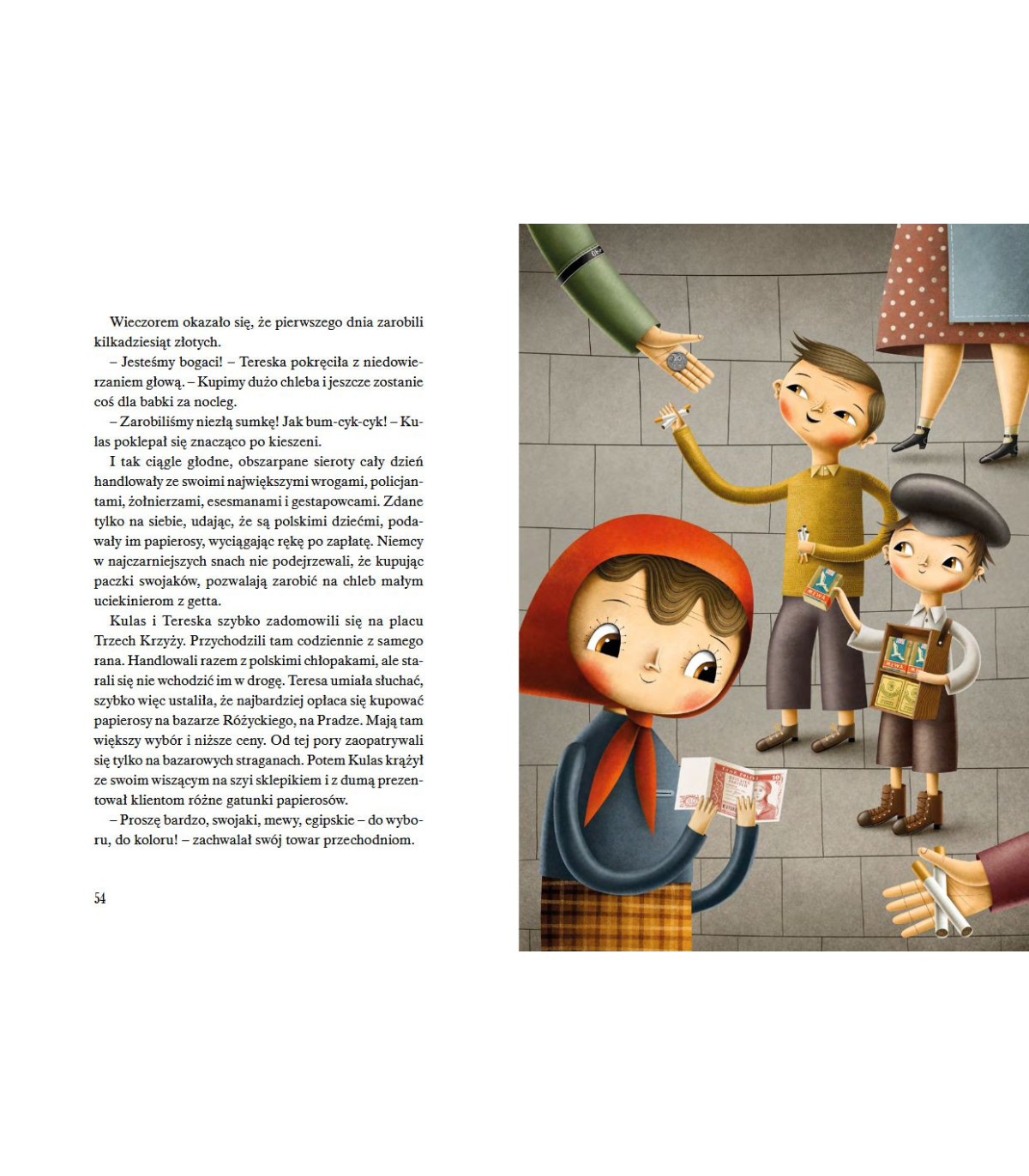 Jak przeżyć wojnę, kiedy jest się sierotą z getta, na którą czyha gestapo? Dzieci z placu Trzech Krzyży miały na to sposób. Sprzedawały gazety i papierosy, a za zarobione pieniądze kupowały jedzenie, ubrania i opłacały nocleg. Bardzo dbały o czystość i schludny wygląd, bo ich głównymi klientami byli… Niemcy!