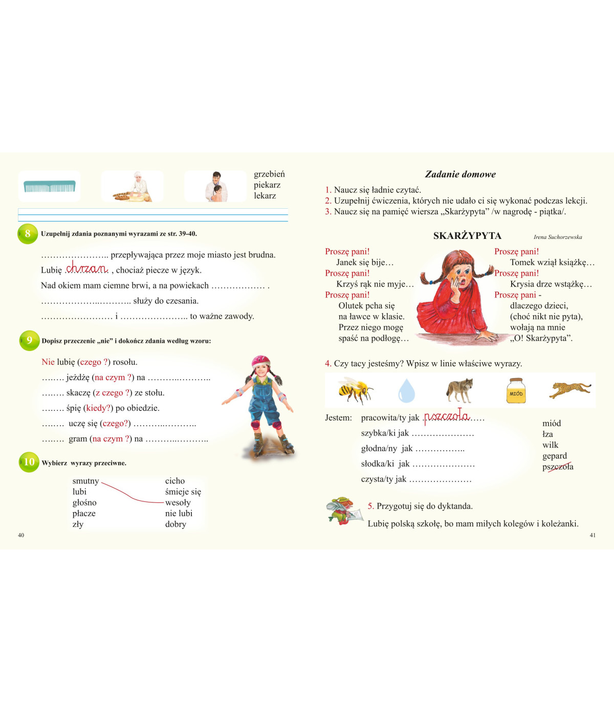 Każdy blok lekcyjny ma podobny układ i daje uczniowi przewidywalność i poczucie bezpieczeństwa. Ćwiczenia i zabawy językowe przewidziane na każdy etap nauki sprawdzają rozumienie tekstów i utrwalają słownictwo. Powtarzają dwuznaki, zmiękczenia, ćwiczenia na sylabach i konsekwentnie ćwiczą budowę zdań. Ich różnorodność dostarcza dzieciom miłej zabawy w szkole i w domu.