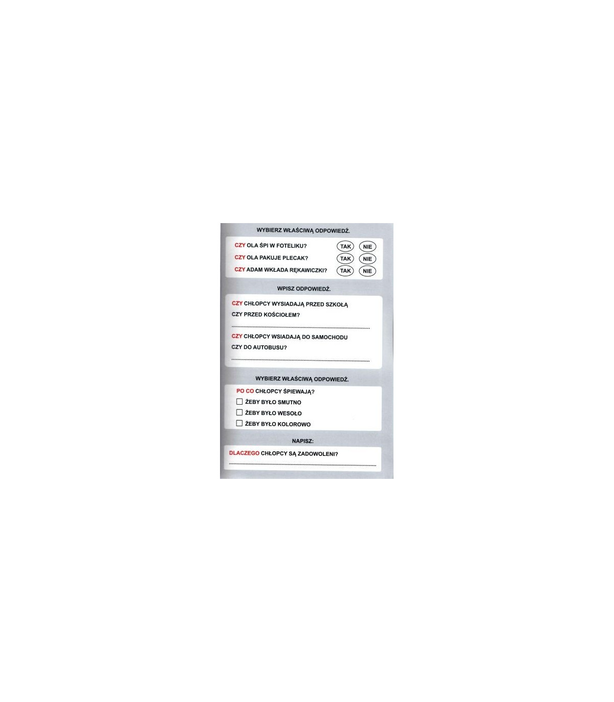 Do krótkich, napisanych prostym językiem opowiadań Autorki przygotowały szereg zadań, których celem jest nauka zadawania i formułowania pytań.