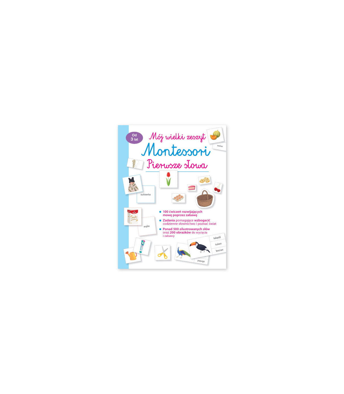 Książka zawiera ponad 100 ćwiczeń opracowanych zgodnie z zasadami pedagogiki Montessori, dzięki którym dziecko może uczyć się poprzez zabawę, rozwijając umiejętności językowe i wzbogacając słownictwo. Znalazło się tu 500 zilustrowanych słów dotyczących 20 obszarów tematycznych, takich jak dom, kuchnia, ogród, środki transportu czy kolory.