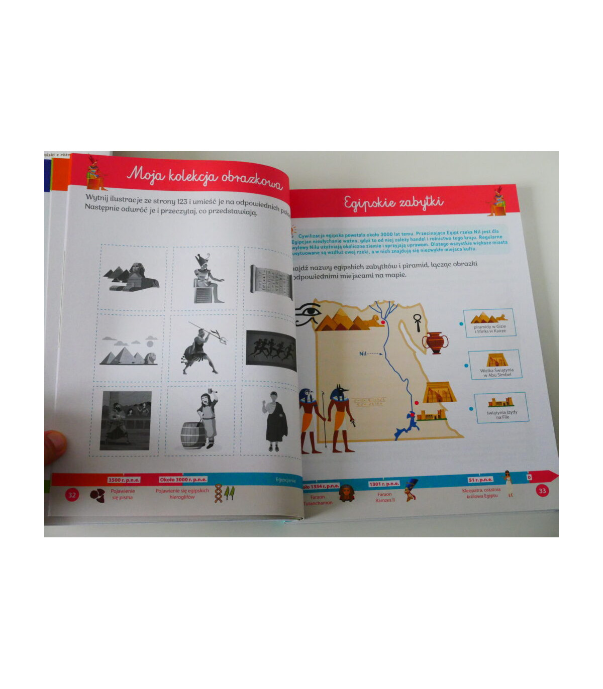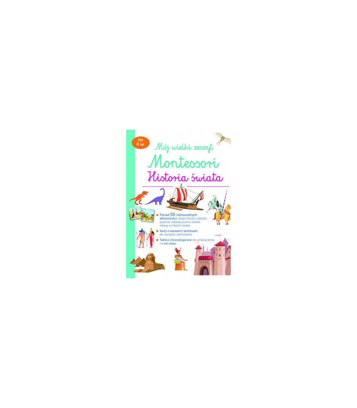Ta wyjątkowa książka, przygotowana zgodnie z założeniami pedagogiki Montessori, pomoże twojemu dziecku w aktywnym poznawaniu ważnych okresów w historii świata. Każdy okres wprowadzany jest poprzez odkrywanie i zabawę: scenki do układania, obrazki do sortowania, podróże do rysowania na mapie itd. Elementy do wycinania umieszczone na końcu książki służą ćwiczeniu sprawności manualnej i zapamiętywaniu. Z pojęciem chronologii dziecko zapozna się dzięki ilustrowanym tablicom chronologicznym, które pojawiają się w całej książce i pomagają zrozumieć zależności między postaciami i wydarzeniami. Dziecko będzie mogło własnoręcznie wyprodukować papirus, wykonać iluminację ozdobnej litery jak w średniowiecznym manuskrypcie lub – niczym Leonardo da Vinci – zbudować maszynę latającą… Zapraszamy do wędrówki przez historię.