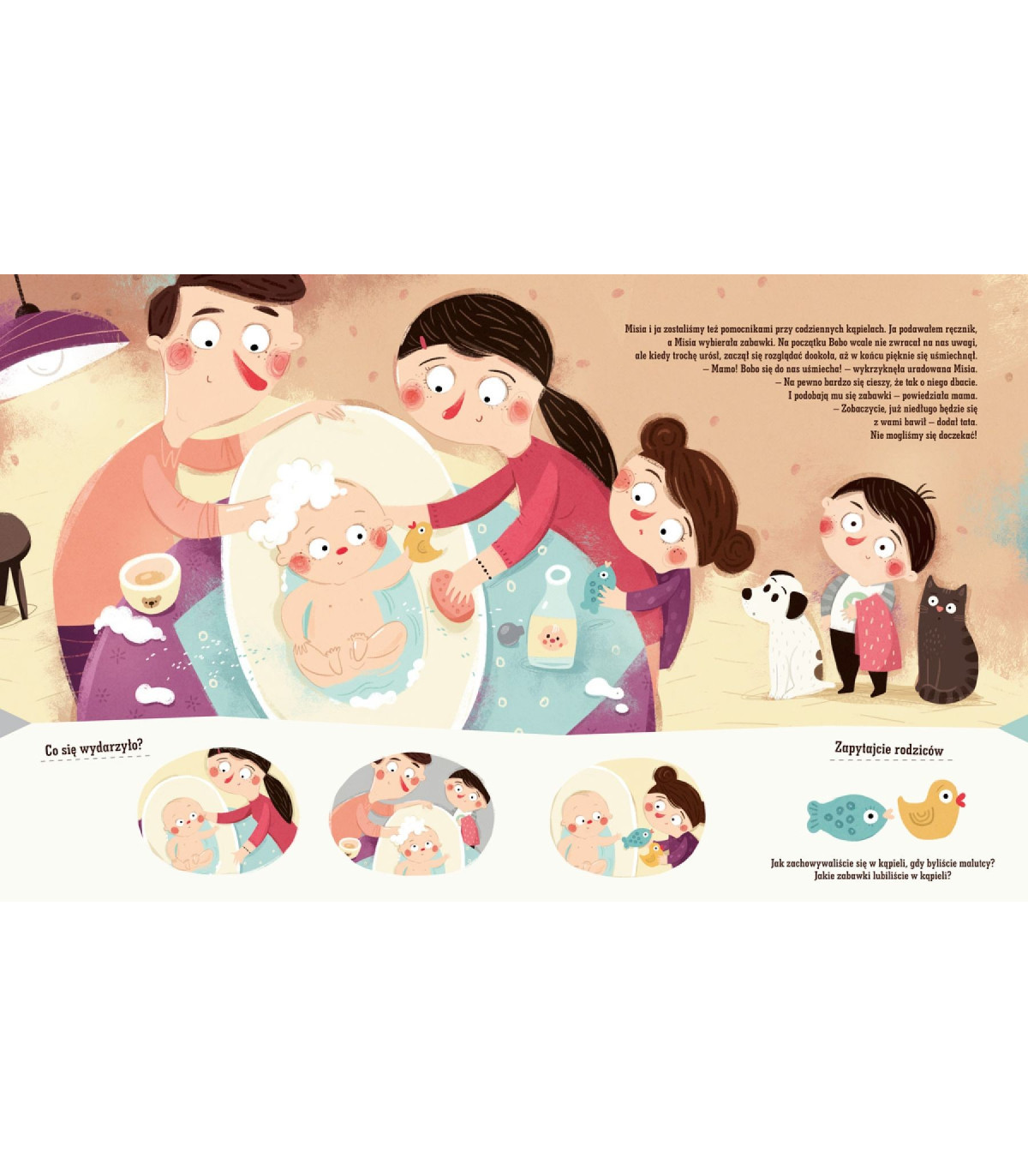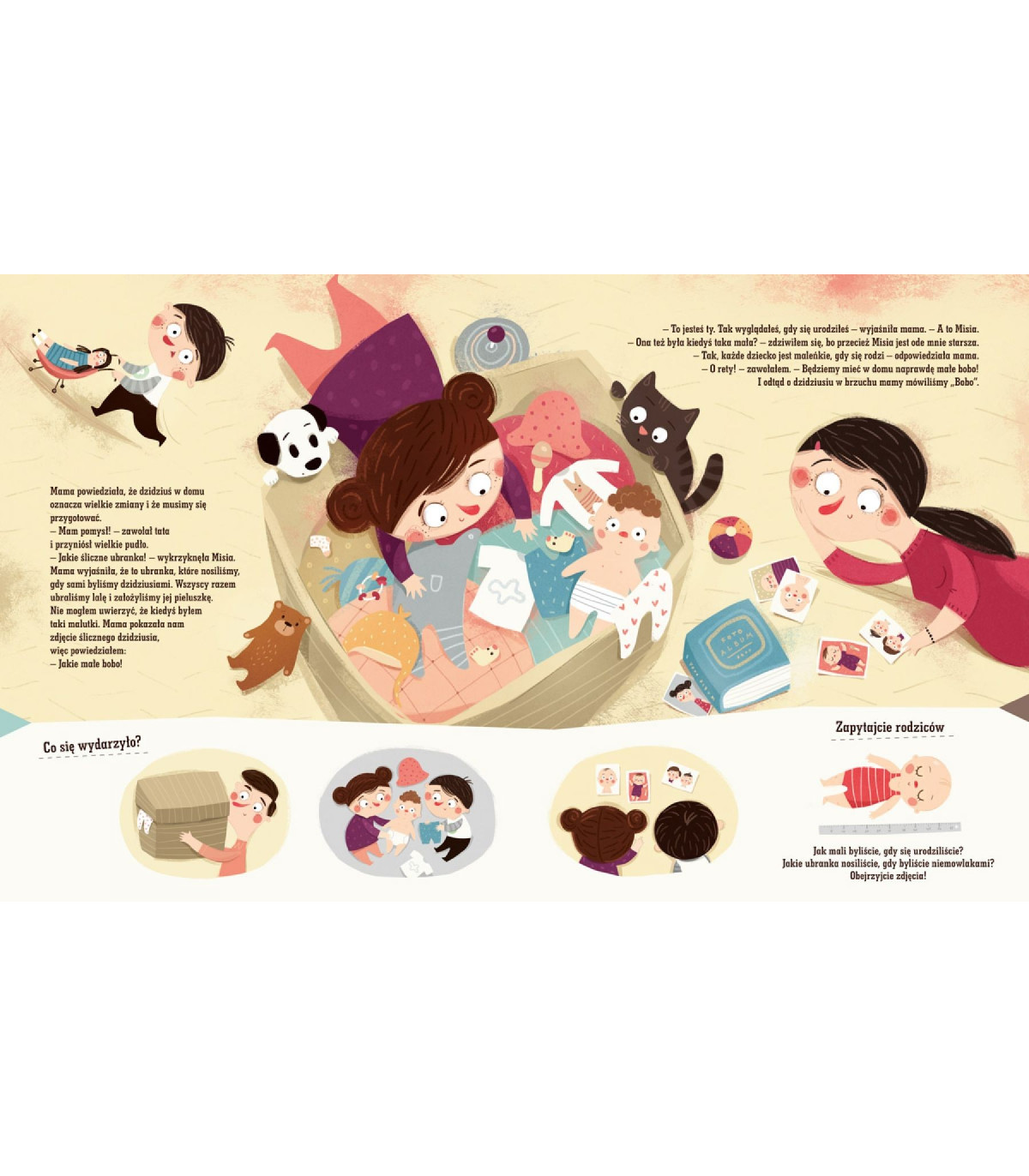 Pod każdą dużą ilustracją znajdują się dodatkowe obrazki mobilizujące do opisywania przeżyć bohaterów własnymi słowami, a także pytania skłaniające do rozmowy z rodzicem na temat szczególnie interesujący każdego malucha: własne przyjście na świat.