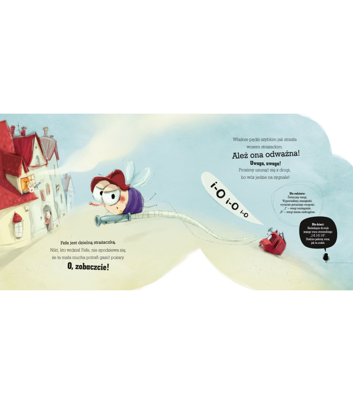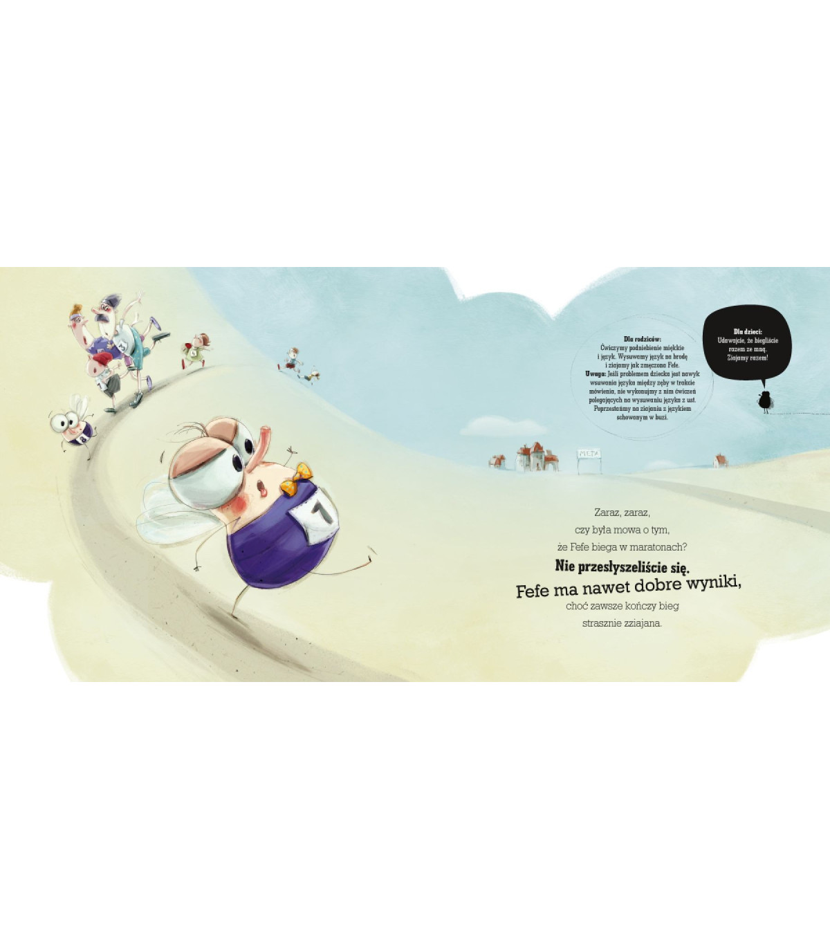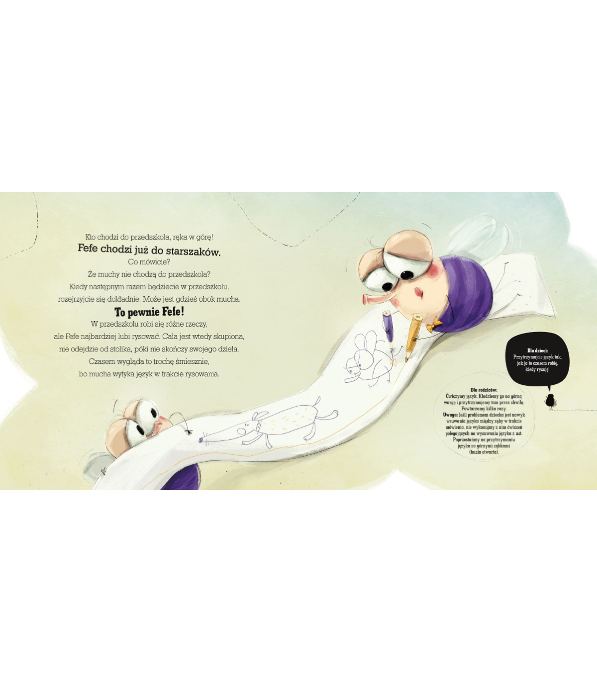 Podstawą poprawnej wymowy jest między innymi odpowiednia ruchomość narządów artykulacyjnych: warg, języka, podniebienia miękkiego i żuchwy. Warto ją z dzieckiem trenować, a nikt nie zachęci do tego lepiej niż Fefe! To wyjątkowa mucha! Gasi pożary, jeździ samochodem, chodzi do kina, biega w maratonach i jest gwiazdą opery. Kto się z nią zaprzyjaźni, nie będzie się nudzić! Dzięki Fefe ćwiczenia staną się zabawą, a maluch, słuchając opowieści o przygodach muszki i realizując wyznaczone przez nią zadania, nawet się nie zorientuje, że właśnie wykonał ważną pracę.