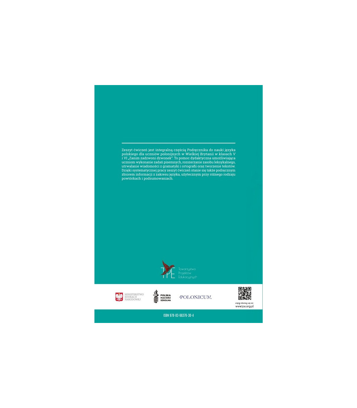 The workbook is an integral part of the Polish language textbook for students of Polish origin in Great Britain in grades 5 and 6 "Before the Bell Rings". It is a teaching aid that allows students to complete written tasks, expand their vocabulary, consolidate knowledge of grammar and spelling, and create texts. Thanks to systematic work, the workbook will also become a handy collection of information on the language, useful for various types of repetitions and summaries.