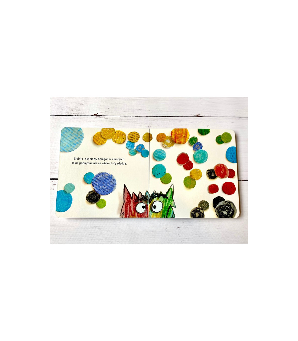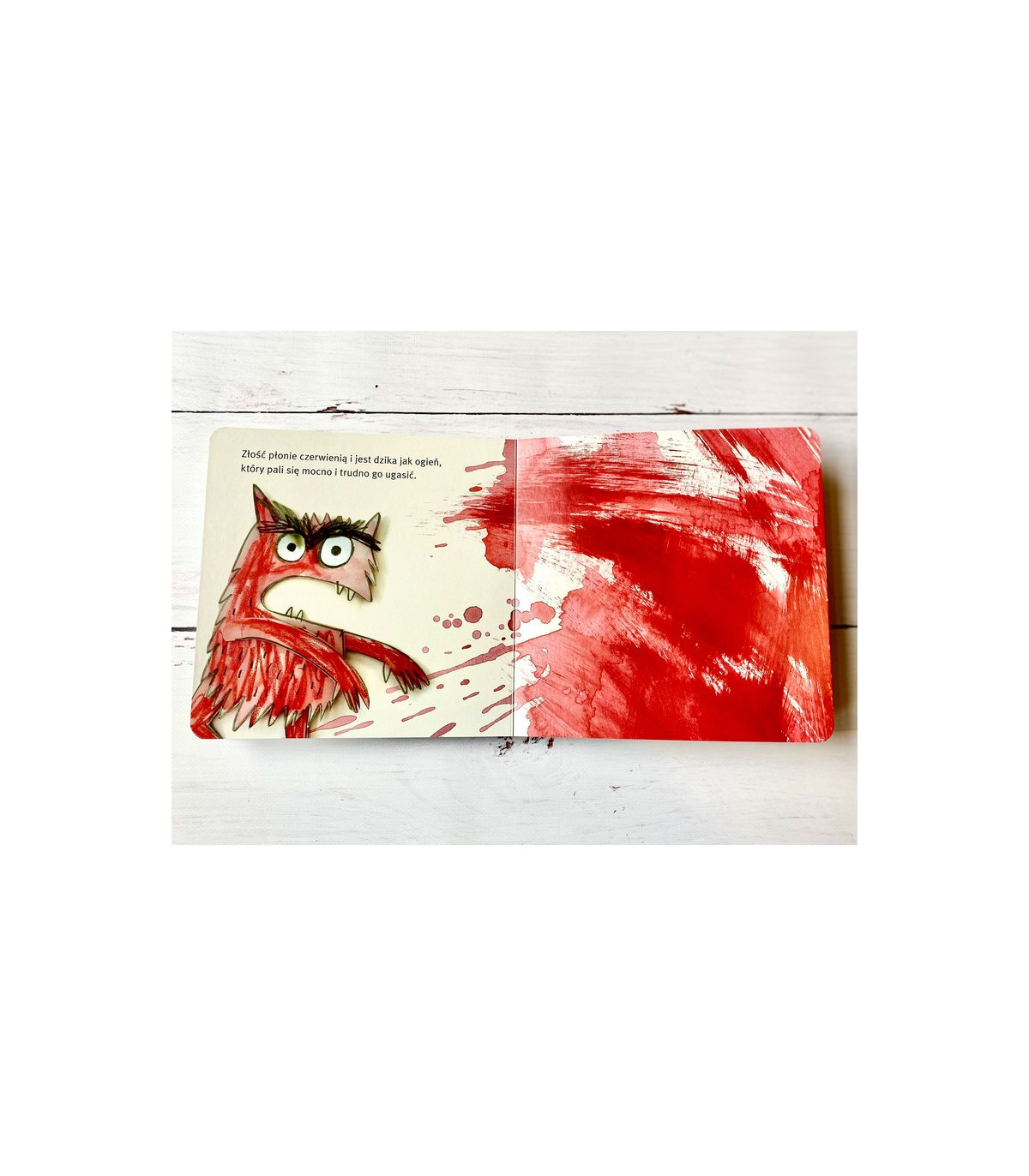 Jak rozpoznać złość? Po tym, że jest dzika jak ogień i że trudno ją ugasić. A co się dzieje, kiedy się boisz? Anna Llenas tłumaczy potworowi: ”Robisz się wtedy malutki i nieważny. Myślisz, że nie dasz rady zrobić tego, o co cię proszą”. A gdy ogarnia nas spokój lub szaleńcza radość? I na to są odpowiednie kolory!