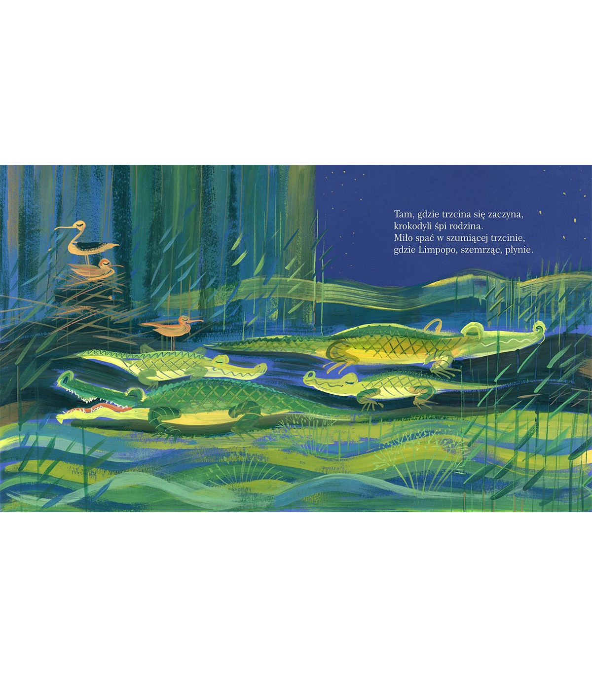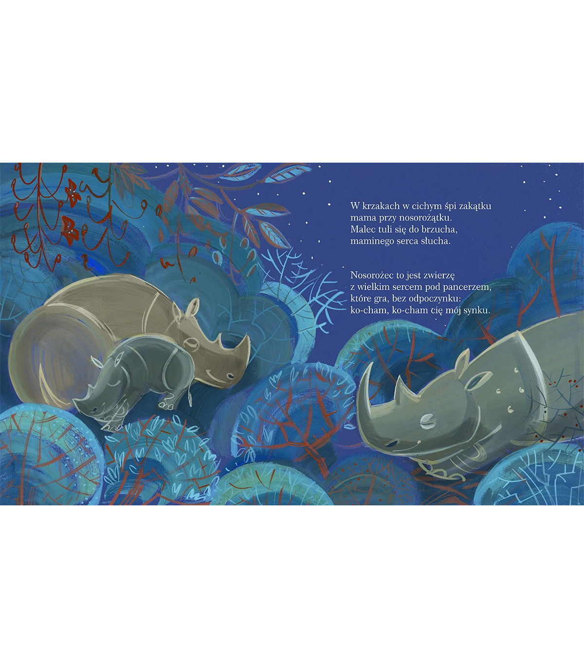 Śliczna usypianka dla najmłodszych i trochę starszych. Wierszyk o afrykańskich zwierzętach ilustrowany pięknymi akwarelami Małgorzaty Flis. Bohaterowie są bajkowi, ale też prawdziwi. Na przykład nosorożątko i jego mama. W naturze, tak samo jak w wierszyku, są bardzo mocno ze sobą związani, przez kilka pierwszych lat życia. Mama nie ma w tym czasie innych nosorożątek i wszędzie chodzą razem.