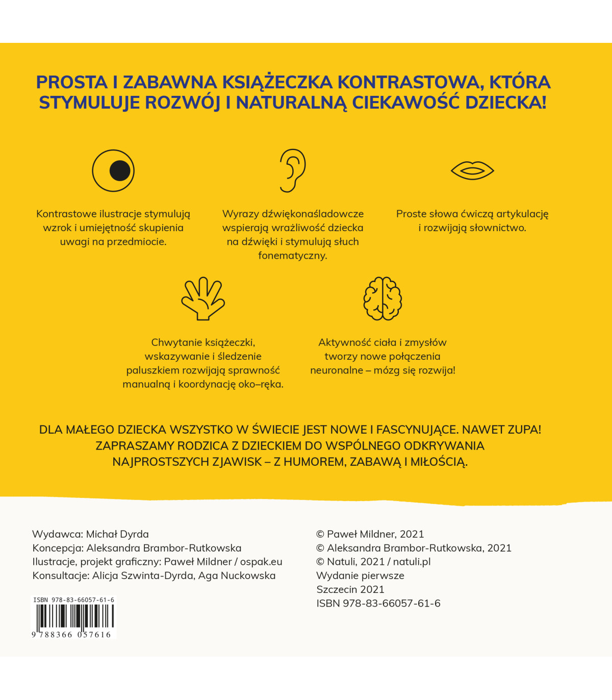 Prosta i zabawna książeczka kontrastowa, która stymuluje rozwój i naturalną ciekawość dziecka.