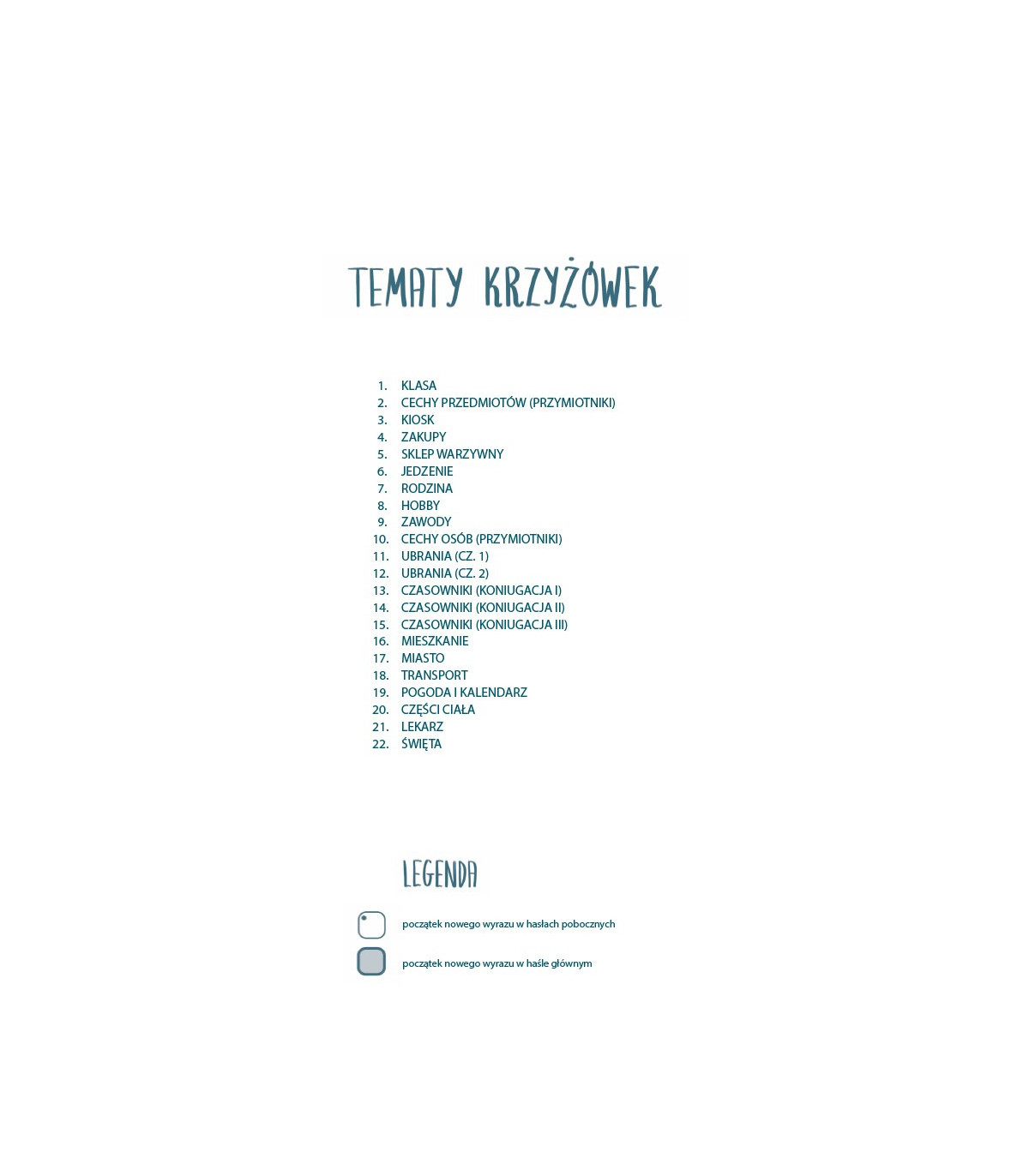 Pogrupowana tematycznie leksyka została ujęta w atrakcyjną formę 22 krzyżówek, w których zamiast tradycyjnych, tj. słownych, objaśnień do poszczególnych haseł posłużono się ilustracjami. Tym sposobem rozwiązujący koncentrują się wyłącznie na słownictwie dotyczącym konkretnego tematu i nie napotykają trudności związanych z rozumieniem opisu haseł.