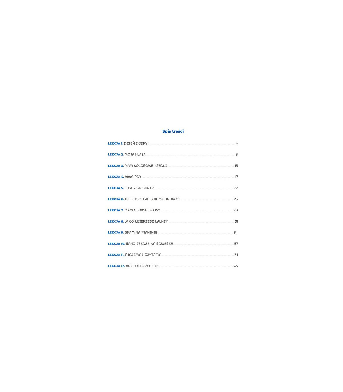 Atrakcyjna szata graficzna i ciekawe ilustracje inspirują do podejmowania rozmów na tematy bliskie dzieciom, czemu służy odpowiedni dobór słownictwa z zakresu różnych kręgów tematycznych (np. pierwsze kontakty, przybory szkolne, jedzenie, wygląd, czynności wykonywane w domu, w szkole, latem, zimą) powiązanych z określonymi zagadnieniami gramatycznymi.