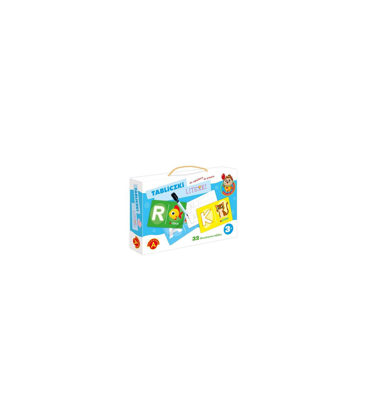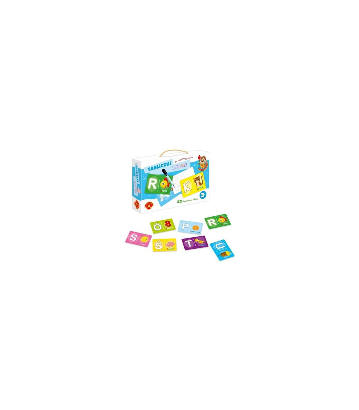 Na każdej z nich znajduje się obrazek oraz literka zaczynająca jego nazwę. Na odwrocie tabliczek znajdują się przykłady ćwiczeń grafomotorycznych. Dzięki sucho-ścieralnemu mazakowi, ćwiczenia można powtarzać wielokrotnie. Zabawka jest doskonałym pretekstem do poznania alfabetu i nauki pisania.