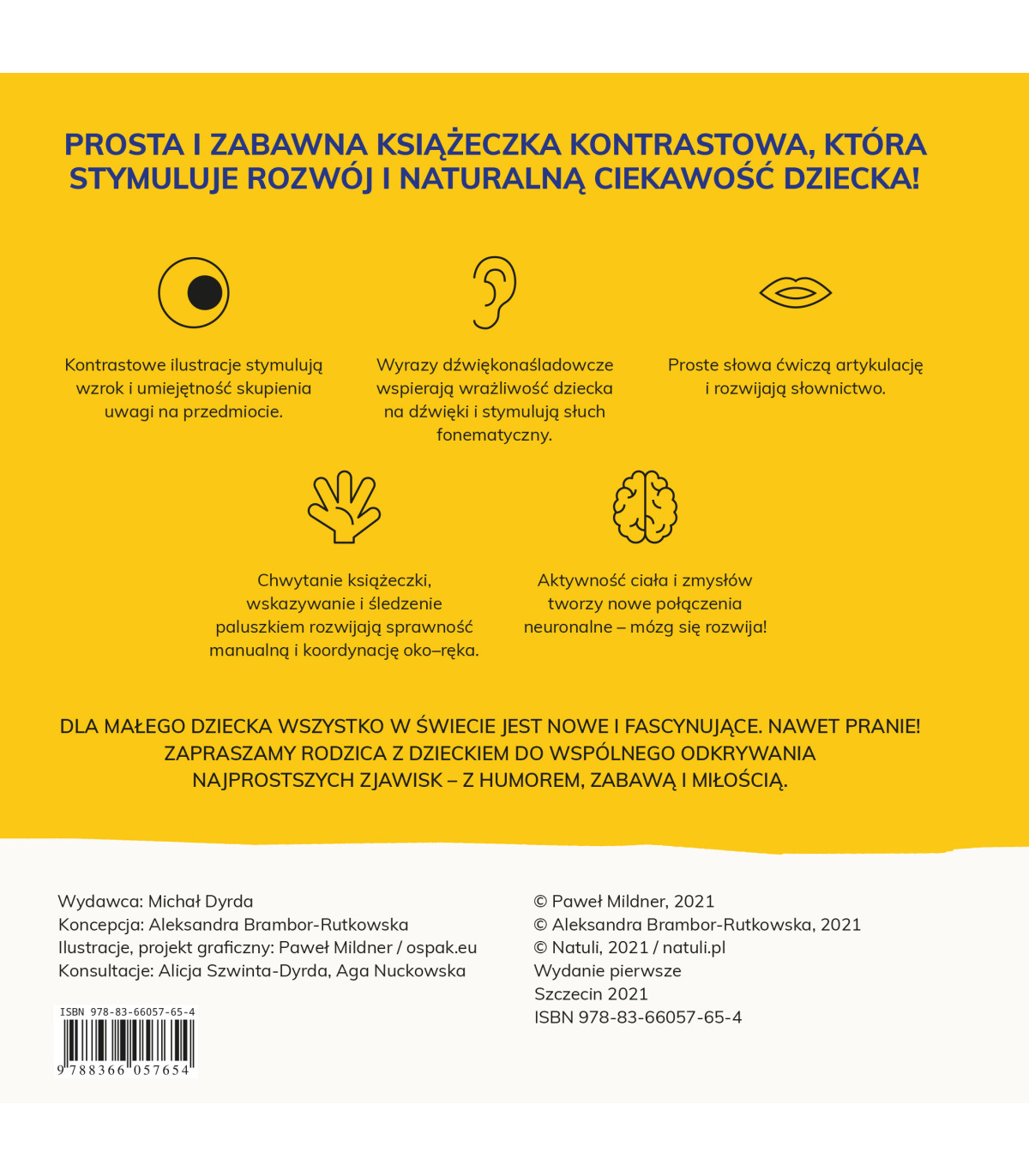 Prosta i zabawna książeczka kontrastowa, która stymuluje rozwój i naturalną ciekawość dziecka.