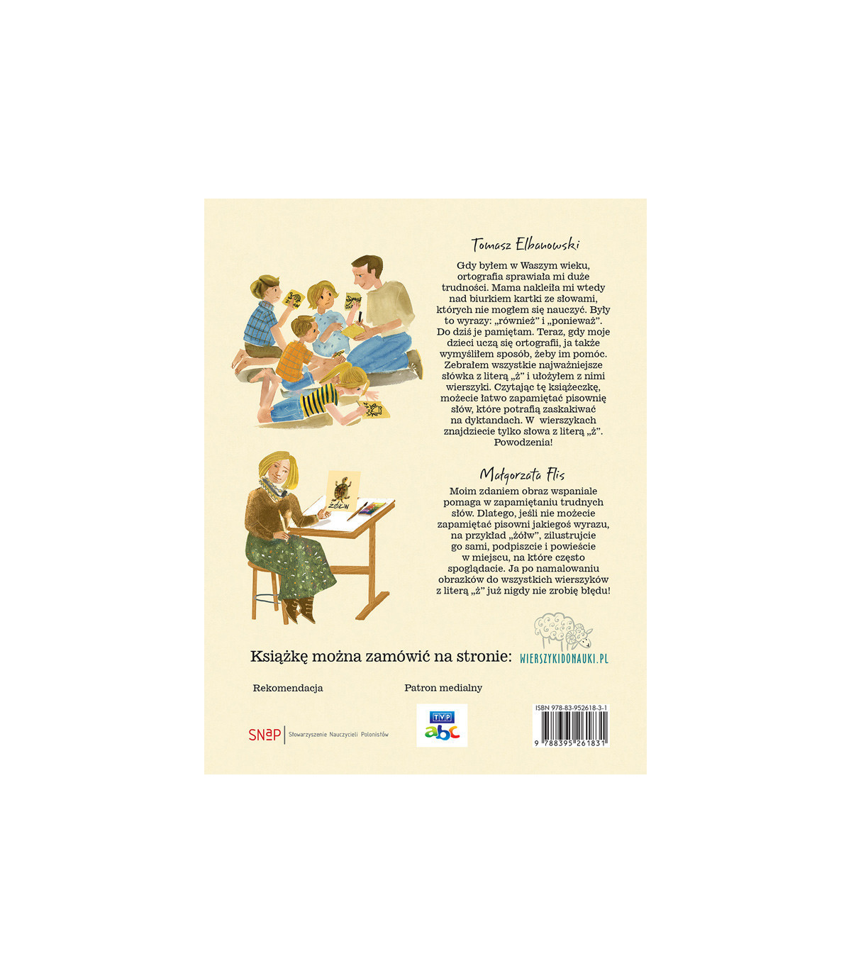 Wierszyki ortograficzne zawierają wszystkie podstawowe wyrazy z ż niewymiennym i najważniejsze wyrazy z ż wymiennym. Nowatorski pomysł na naukę ortografii. Słowa powiązane w krótkie, zabawne historie, stają się dużo łatwiejsze do zapamiętania. Pięknie ilustrowana akwarelami Małgorzaty Flis.