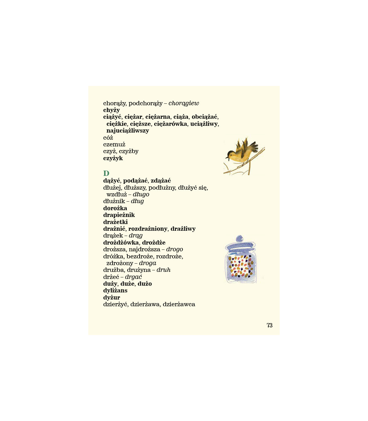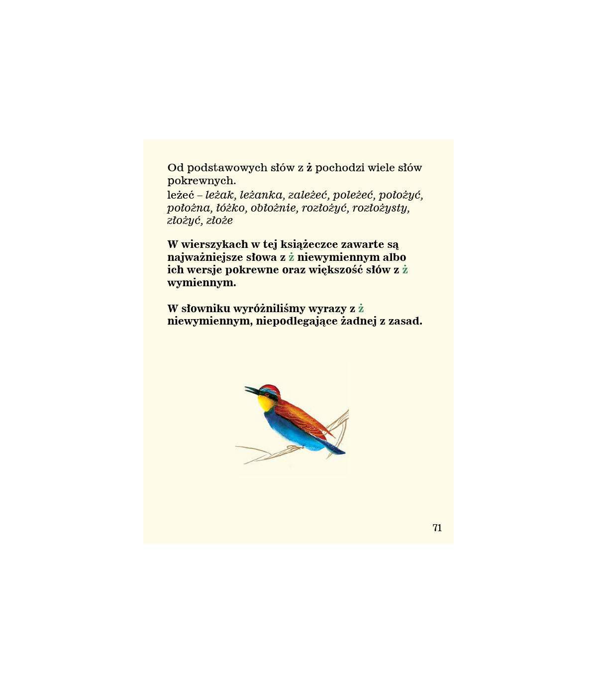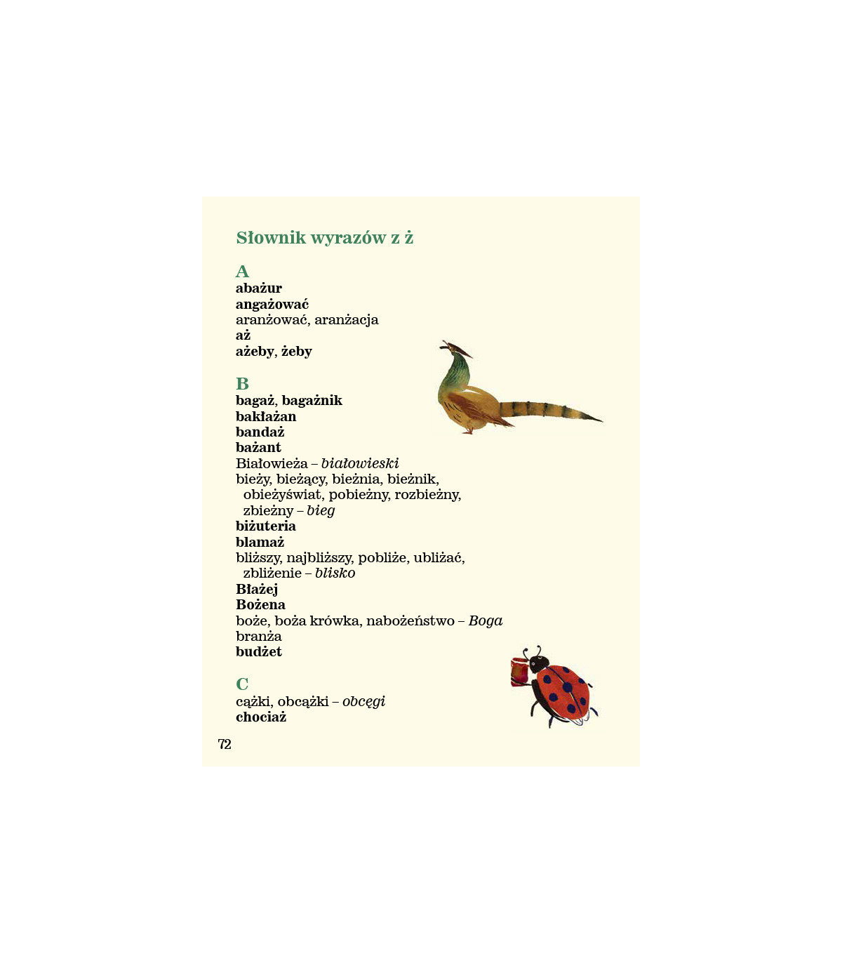 Druga z trzech części wierszyków ortograficznych. Zawiera wszystkie podstawowe wyrazy z ż niewymiennym i najważniejsze wyrazy z ż wymiennym. Nowatorski pomysł na naukę ortografii. Słowa powiązane w krótkie, zabawne historie, stają się dużo łatwiejsze do zapamiętania. Pięknie ilustrowana akwarelami Małgorzaty Flis.