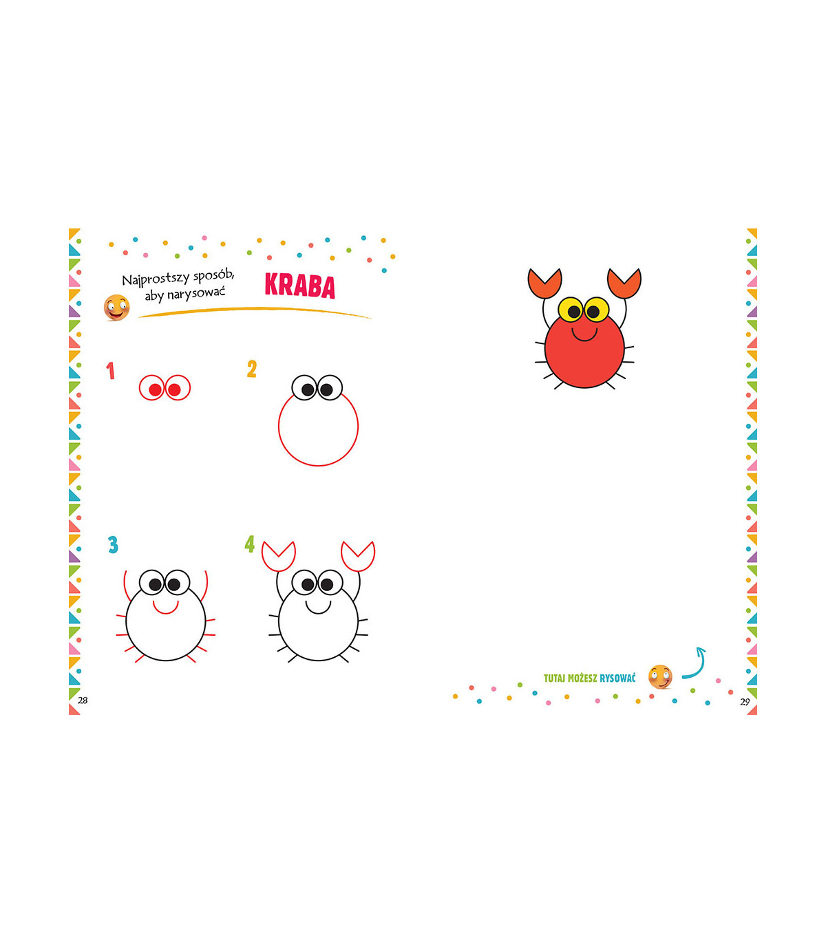 Sposób narysowania danej ilustracji przedstawiony jest po kolei w czterech najprostszych krokach. W każdym z kolejnych etapów rysowania zostały wyraźnie zaznaczone nowe elementy do dorysowania. Dzięki temu każde dziecko samodzielnie będzie w stanie narysować samochód, kotka, lalkę, motocykl czy tygrysa!