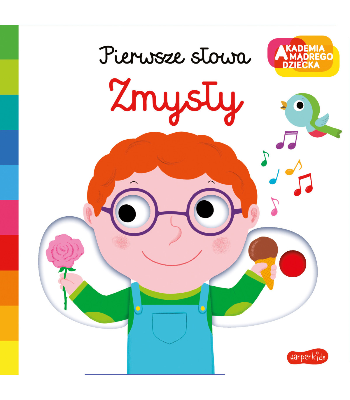 Zmysły to kartonowa książeczka z której maluch, dowiaduje się, jakie są zmysły i do czego służą. Na przykład przy słuchu mówimy o różnych dźwiękach typu śpiew ptaka czy kapanie wody. Przy dotyku pokazujemy kłującą brodę taty i odczuciu jakie wywołuje po jej dotknięciu. Dzięki kolorowym obrazkom, dziecko uczy się nazywać przedmioty z którymi ma styczność na co dzień. Kartonowe książeczki wykonane są z największą starannością, zaokrąglone strony sprawiają, że książeczka jest bezpieczna dla malucha, a ruchome elementy pozwalają ćwiczyć małą motorykę.