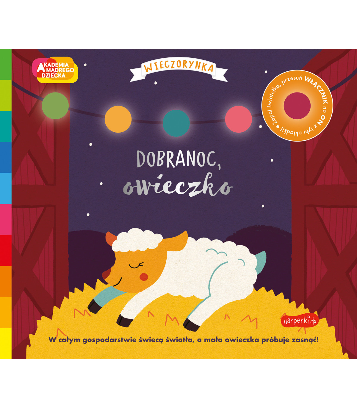 Książka ze światełkami o małej owieczce, która odwiedza wszystkie zwierzątka na farmie, by każdemu życzyć dobrej nocy przed spaniem.