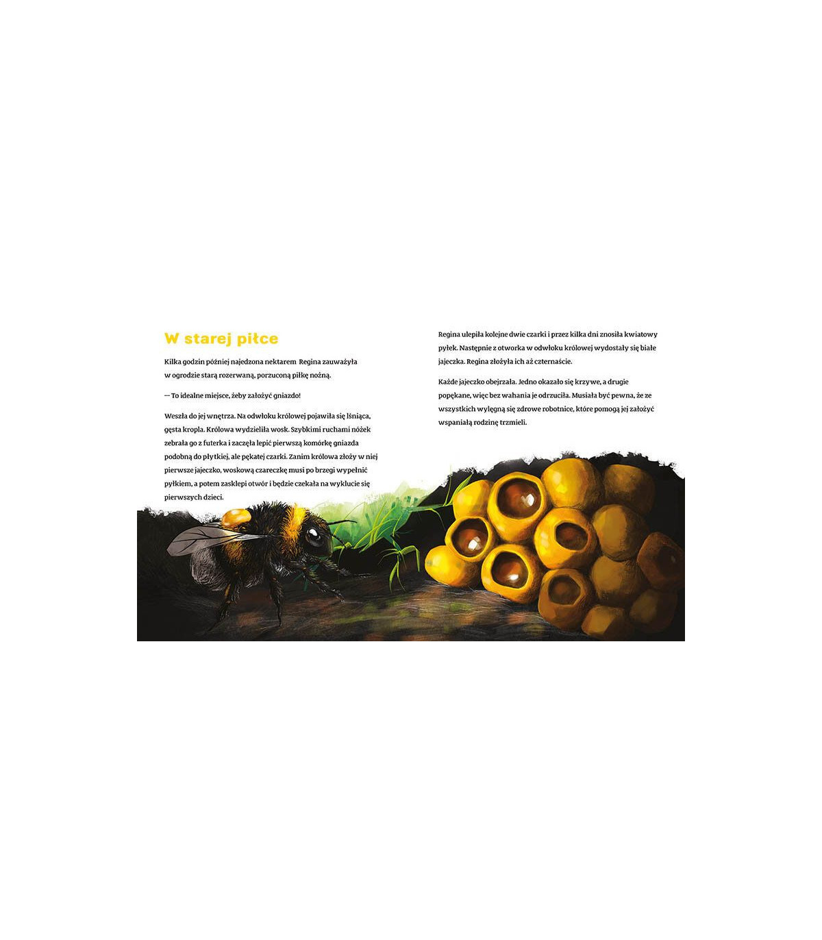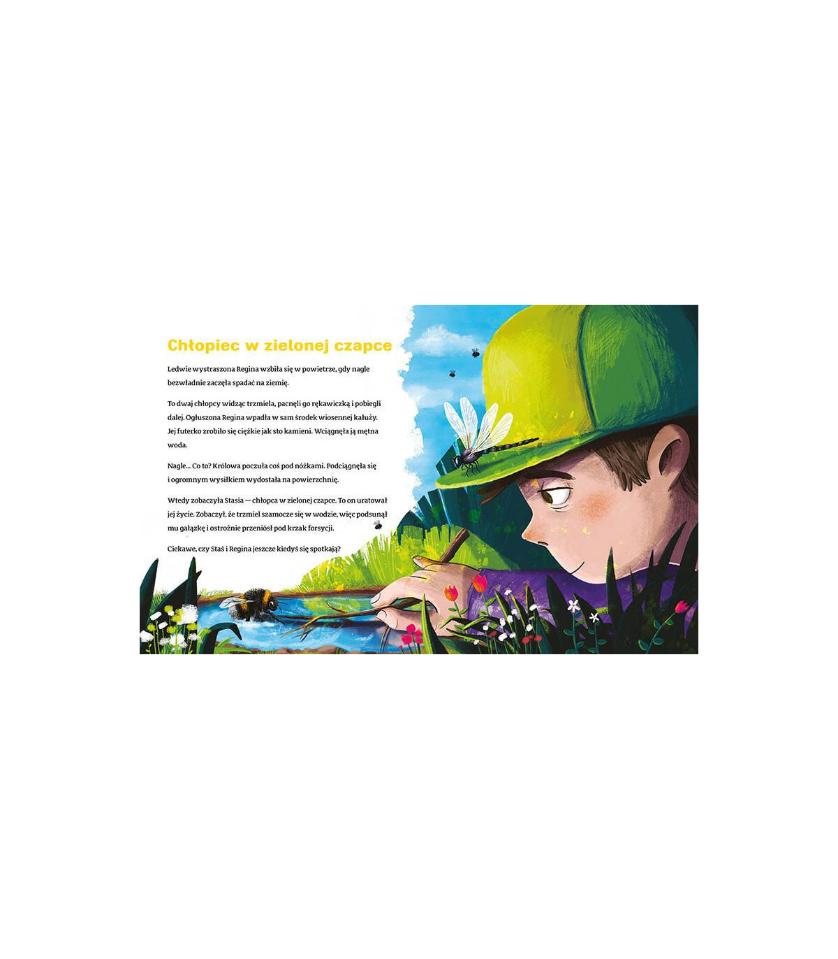 Jest to opowiadanie o królowej trzmieli Regince, która budzi się z zimowego snu, szuka miejsca na założenie gniazda i złożenie w nim jajek. W międzyczasie, gdy szuka pożywienia, natrafia na człowieka, który łamie gałęzie z baziami, na których jest nektar, czyli pożywienie trzmieli, następnie napotkani chłopcy uderzają ją tak, że wpada do kałuży. Regina jest wówczas w wielkim niebezpieczeństwie, lecz na pomoc przychodzi jej chłopiec o imieniu Staś, który pomaga gałązką wydostać się jej z tej śmiertelnej pułapki. Później nasza bohaterka znowu napotyka na swej drodze tego miłego chłopca, gdy przez przypadek wlatuje do jego domu. Tym razem chłopiec również staje na wysokości zadania i pomaga królowej trzmieli wylecieć na wolność.