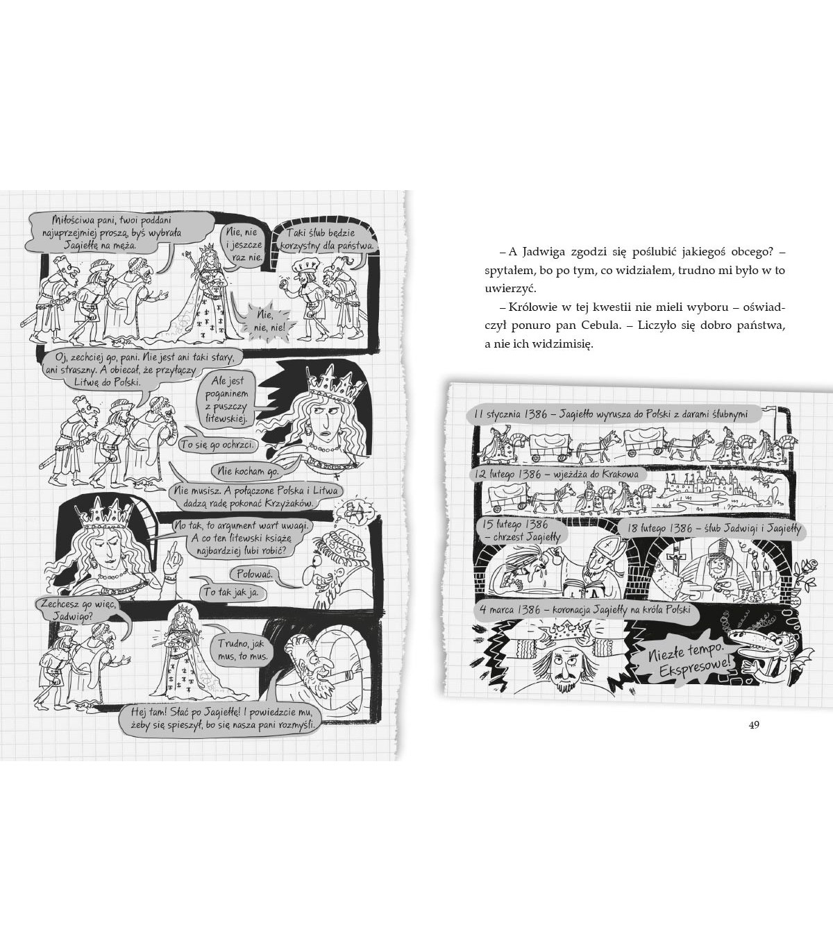 Bogato ilustrowana seria „Ale historia…” z humorem przekazuje fakty historyczne i ciekawostki. Z trzeciej części dowiecie się między innymi, dlaczego słodycze były kiedyś strasznie drogie, jak zbudować most w kilka godzin, co można kupić za królewskie korale i dlaczego Jagiełło jadał zawsze z tego samego drewnianego talerza.