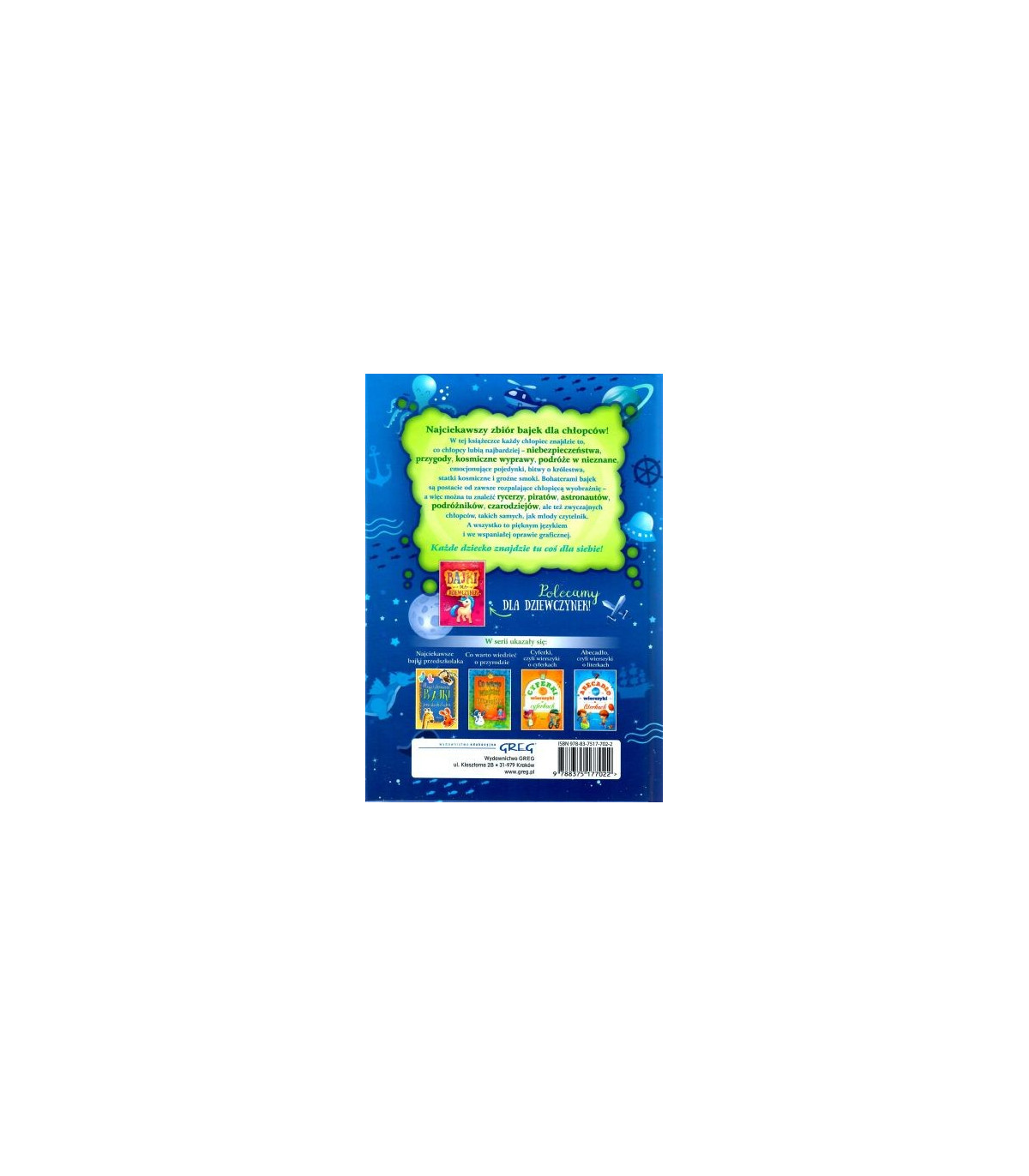 Bajki dla chłopców to ciekawe opowieści, pełne motywów i tematów uwielbianych przez małych czytelników - fascynujące historie o przygodach piratów i astronautów, o olśniewających bitwach i walkach, o wspaniałych zwycięstwach dobra nad złem. Są tu więc odważni piraci, śmiali astronauci, dzielni rycerze, źli czarownicy, magowie, kosmici, a także zwyczajni chłopcy. Najważniejsze jednak, że wszystko zawsze dobrze się kończy! Maluchy nie będą mogły rozstać się z tą książką!
