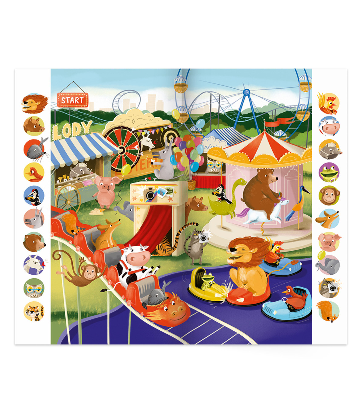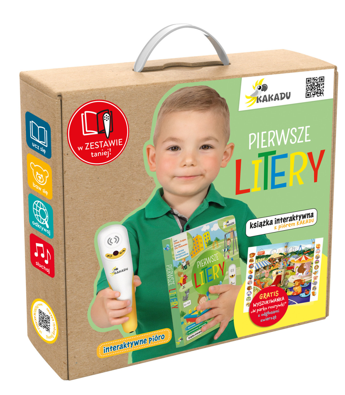 Zestaw zawiera: książkę Pierwsze litery, pióro Kakadu w trwałym etui i planszę z wyszukiwanką W parku rozrywki, dzięki której dzieci sprawdzą swoją spostrzegawczość, poznają nazwy zwierząt i usłyszą odgłosy, jakie one wydają. Całość została zamknięta w pudełku z rączką.