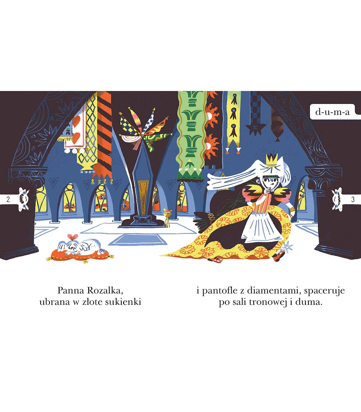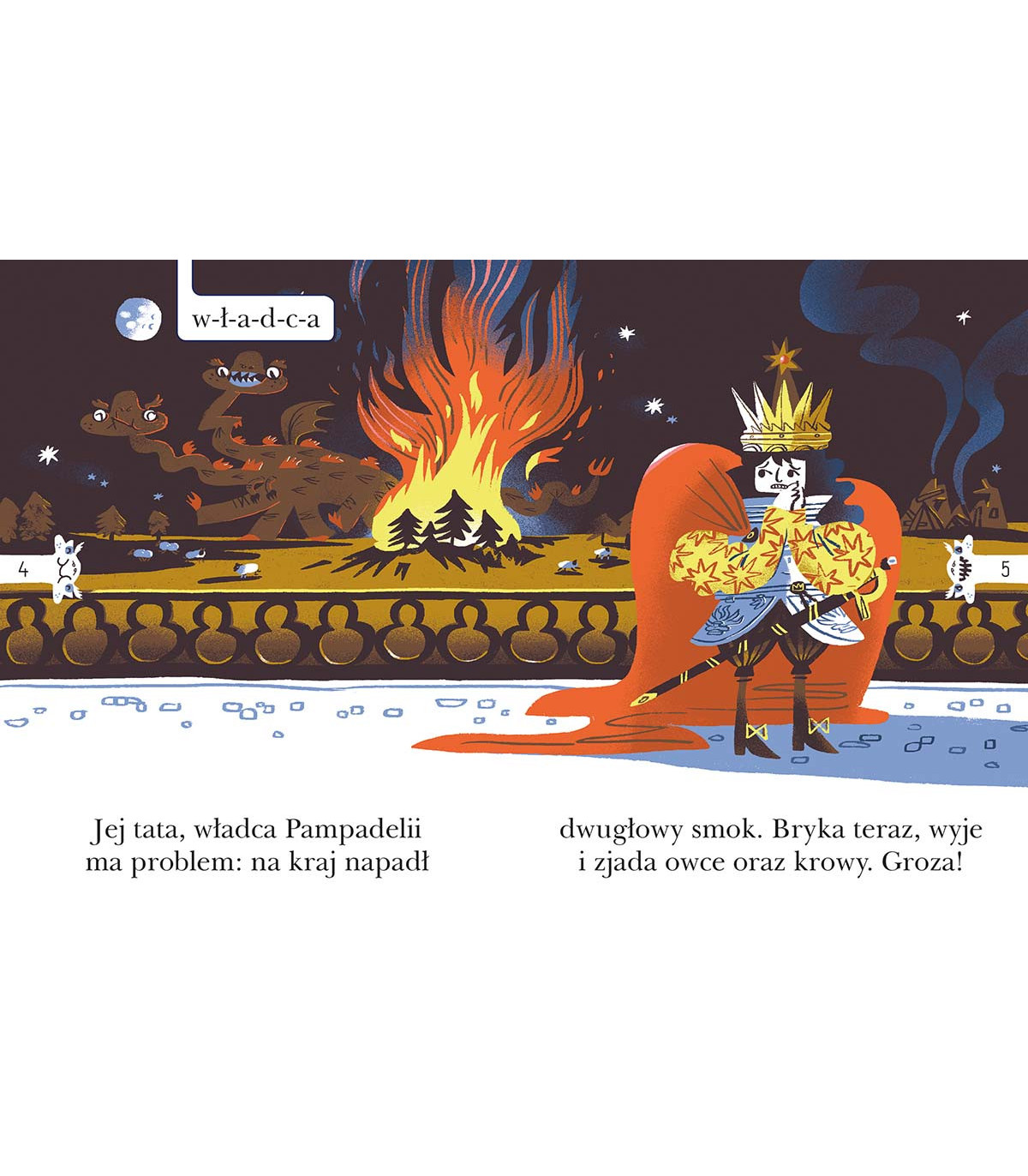 Na Pampadelię, którą włada tato Rozalki, napada dwugłowy smok. Znamienici woje truchleją przed nim ze strachu, a król się zamartwia.