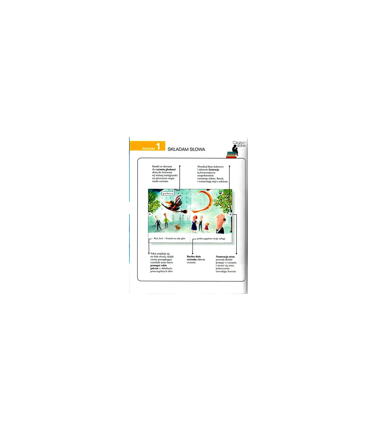 Trzypoziomowy program Czytam sobie to kolekcja wspierających naukę czytania książek przeznaczonych dla dzieci w wieku 5-7 lat. Na poziomie pierwszym, Składam słowa, znajdziemy krótkie, proste zdania, 150-200 wyrazów, a historie napisane są z pominięciem trudniejszych głosek, takich jak "sz" czy "ż". Bardzo duża czcionka ułatwia czytanie. Wybrane słowa zostały również przeliterowane i umieszczone w ramkach, dzięki czemu dzieci mogą ćwiczyć głoskowanie. Wysokiej klasy kolorowe ilustracje Joanny Rusinek, znanej rysowniczki, wspierają rozumienie tekstu i przyciągają uwagę dzieci, a na końcu książki znajdują się zabawne naklejki. Nauka czytania z tą serią to prawdziwa przyjemność.